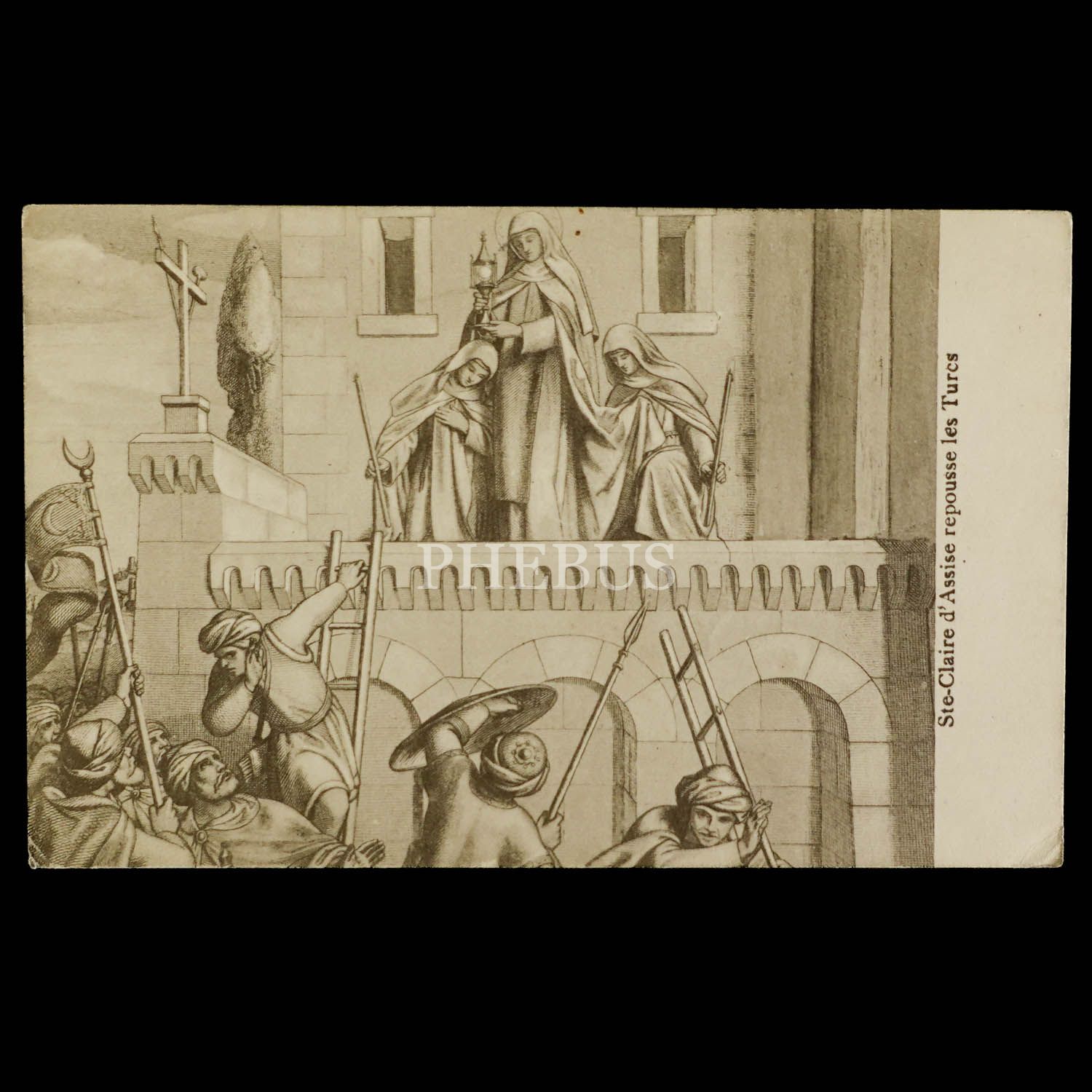 "Assisili Aziz Clare Türkleri püskürtüyor" başlıklı propaganda kartpostalı, "Ste-Claire d´Assie repousse les Turcs"...