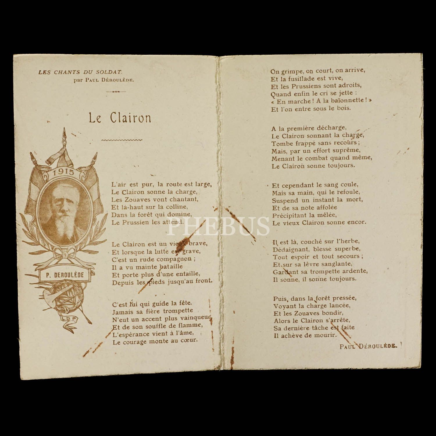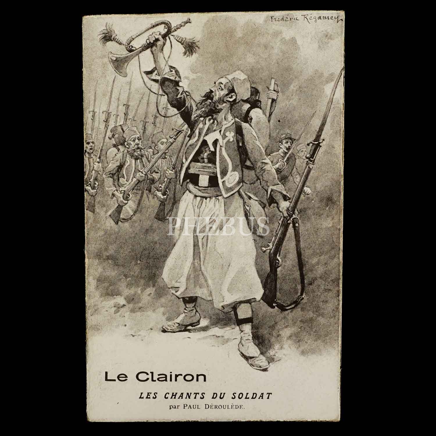 İçerisinde sözleri Paul Deroulede tarafından yazılan asker şarkısı "Le Clairon"un (Boru) sözlerinin yazılı olduğu açılır kartpostal, ed. I. Lapina, Paris...