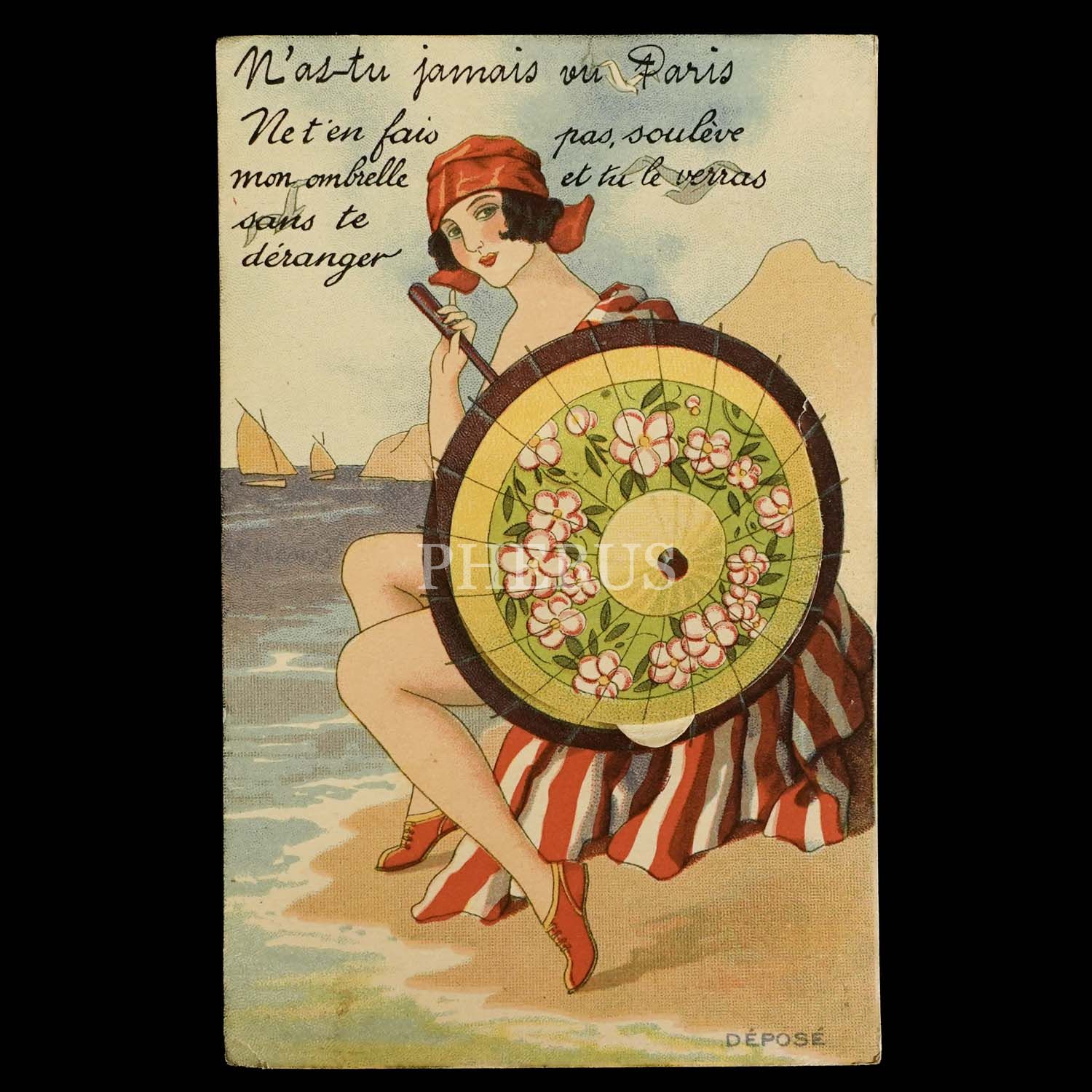 Kadının elinde tuttuğu şemsiye kaldırıldığında içinden Fransa´nın en mühim mimari yapılarının minik fotoğraflarının (10 adet) yer aldığı akordiyon formunda bir şerit çıkan fantazi kartpostal, ed. D. Delboy, fabricant, Mirecourt (Vosges)...