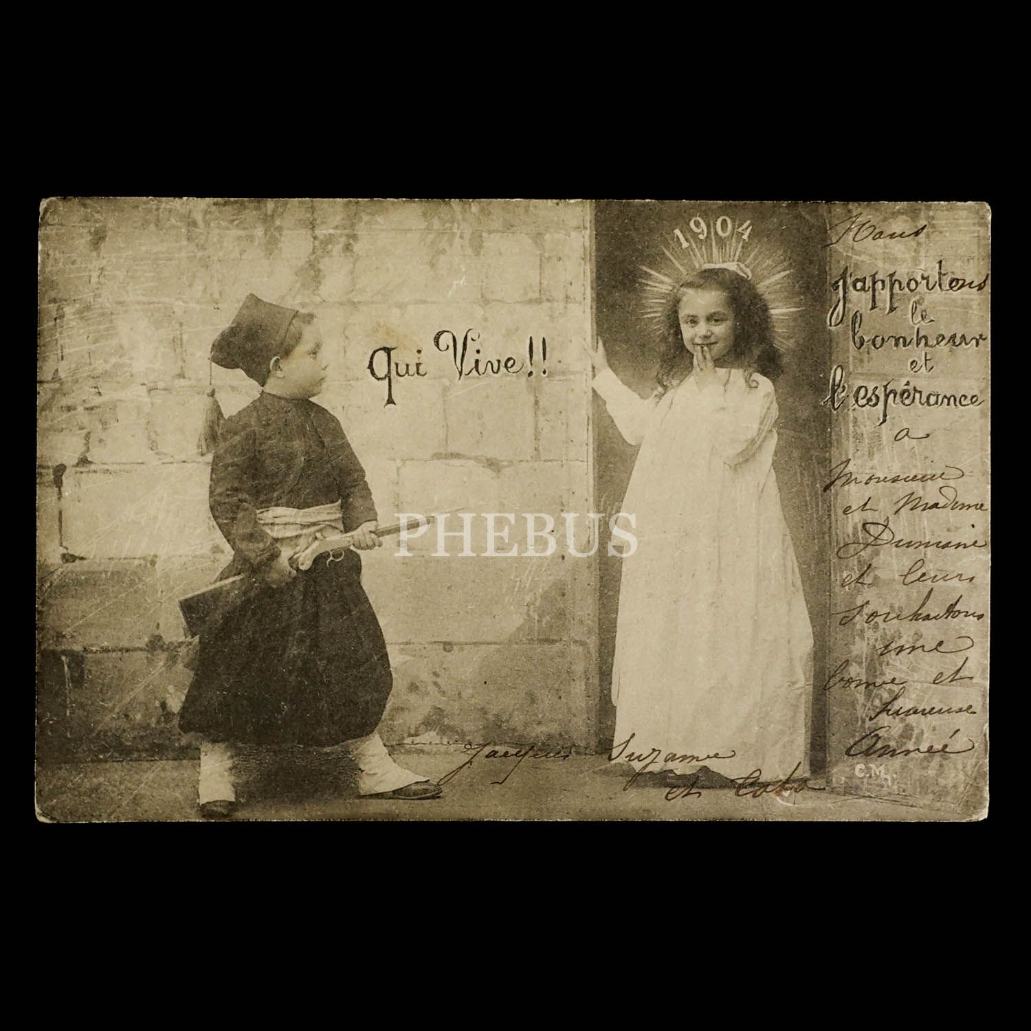 Başında 1904 yazan barış perisi ile eli silahlı çocuk görselli kartpostal, "Qui Vive"...