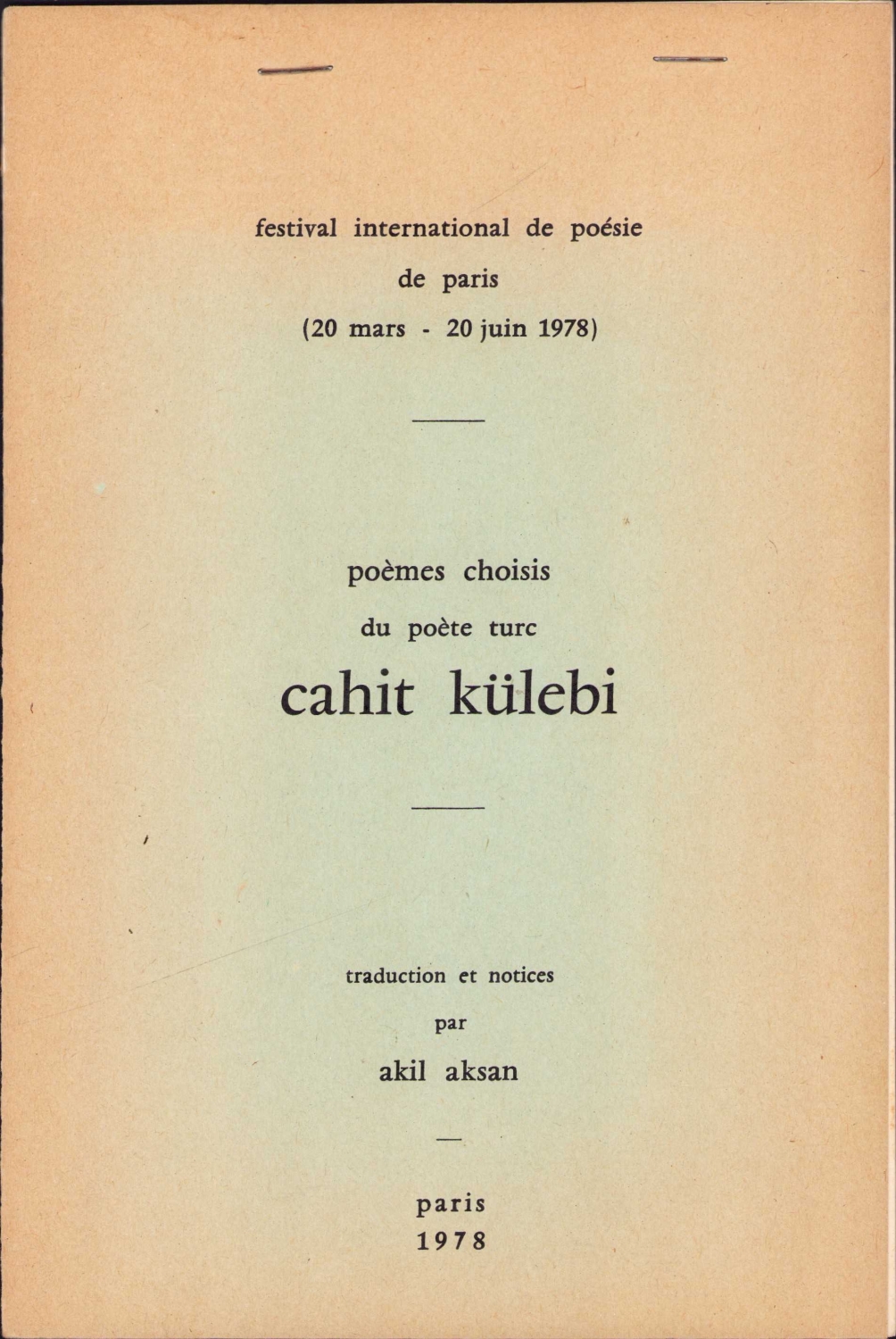 Fransızca Paris Uluslararası Şiir Festivali Cahit Külebi'nin seçilmiş şiirleri, çec., Akil Aksan, Paris, 1978, 10 sayfa, 15x23 cm