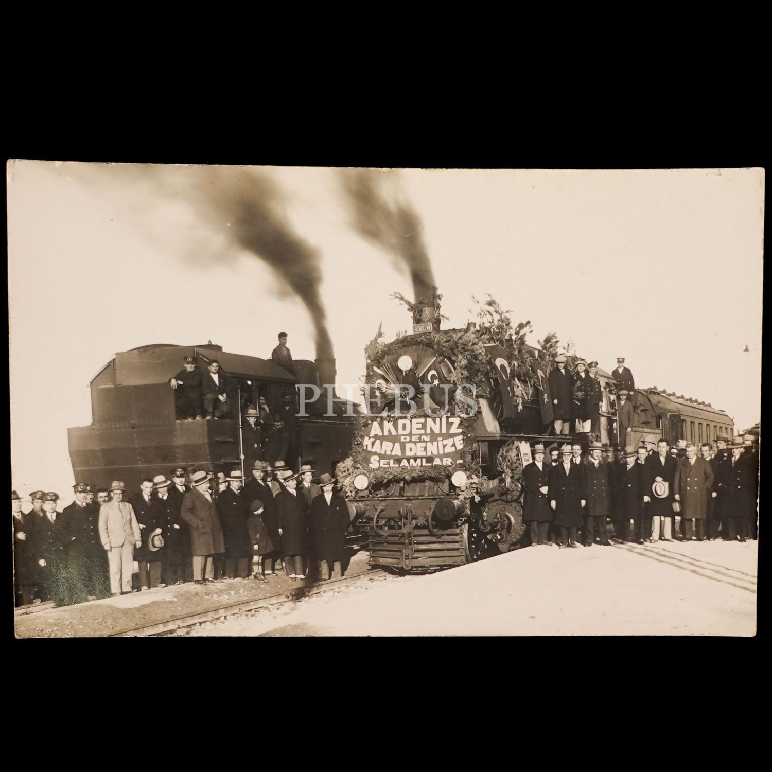 "Akdenizden Karadenize Selamlar" yazılı ve Türk bayraklarıyla süslü lokomotif önünde hatıra fotoğrafı, 14x9 cm...