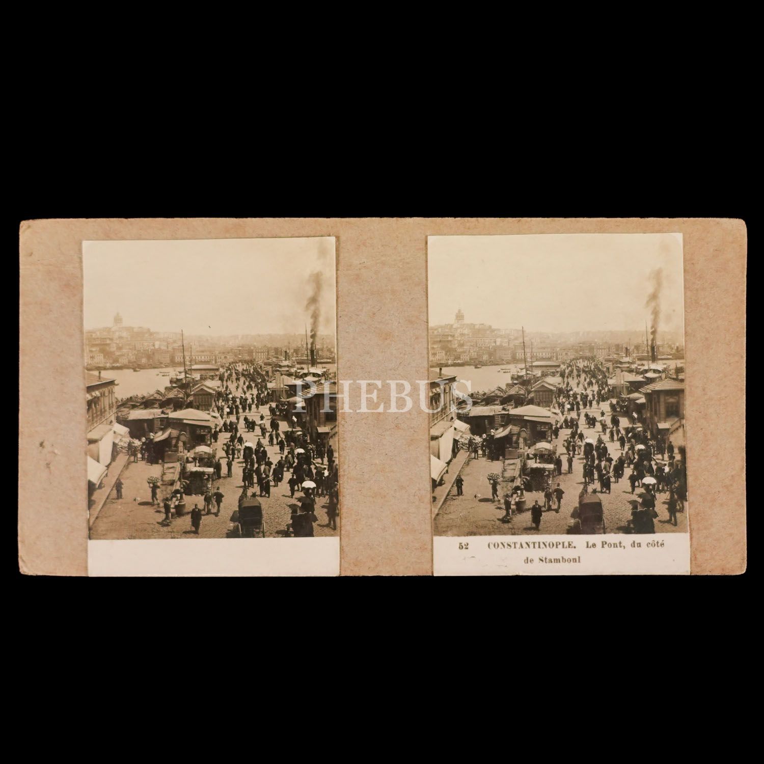 Eminönü´nden Ahşap Galata Köprüsü ve Pera´ya bakış konulu stereoview kart, "Constantinople - Le Pont, du cote de Stamboul", 18x9 cm...