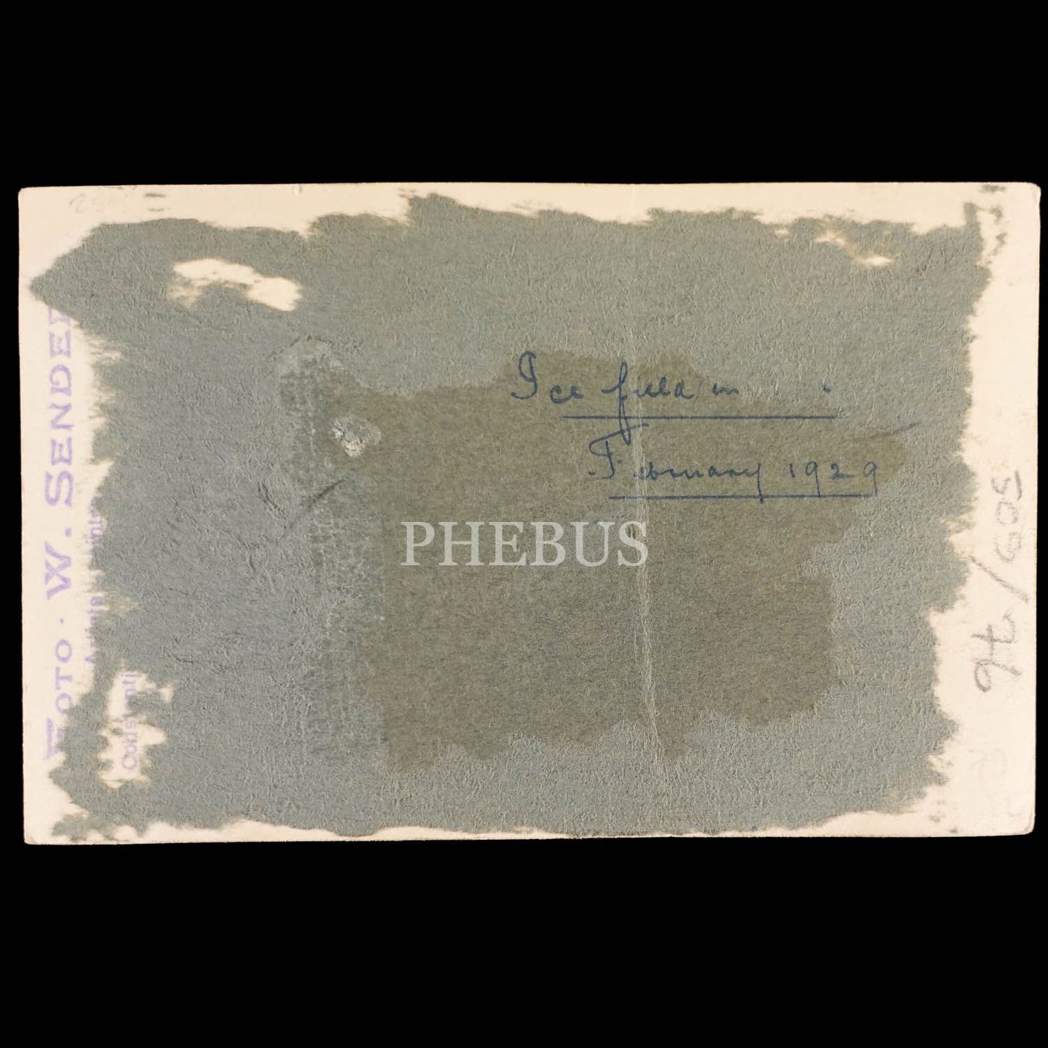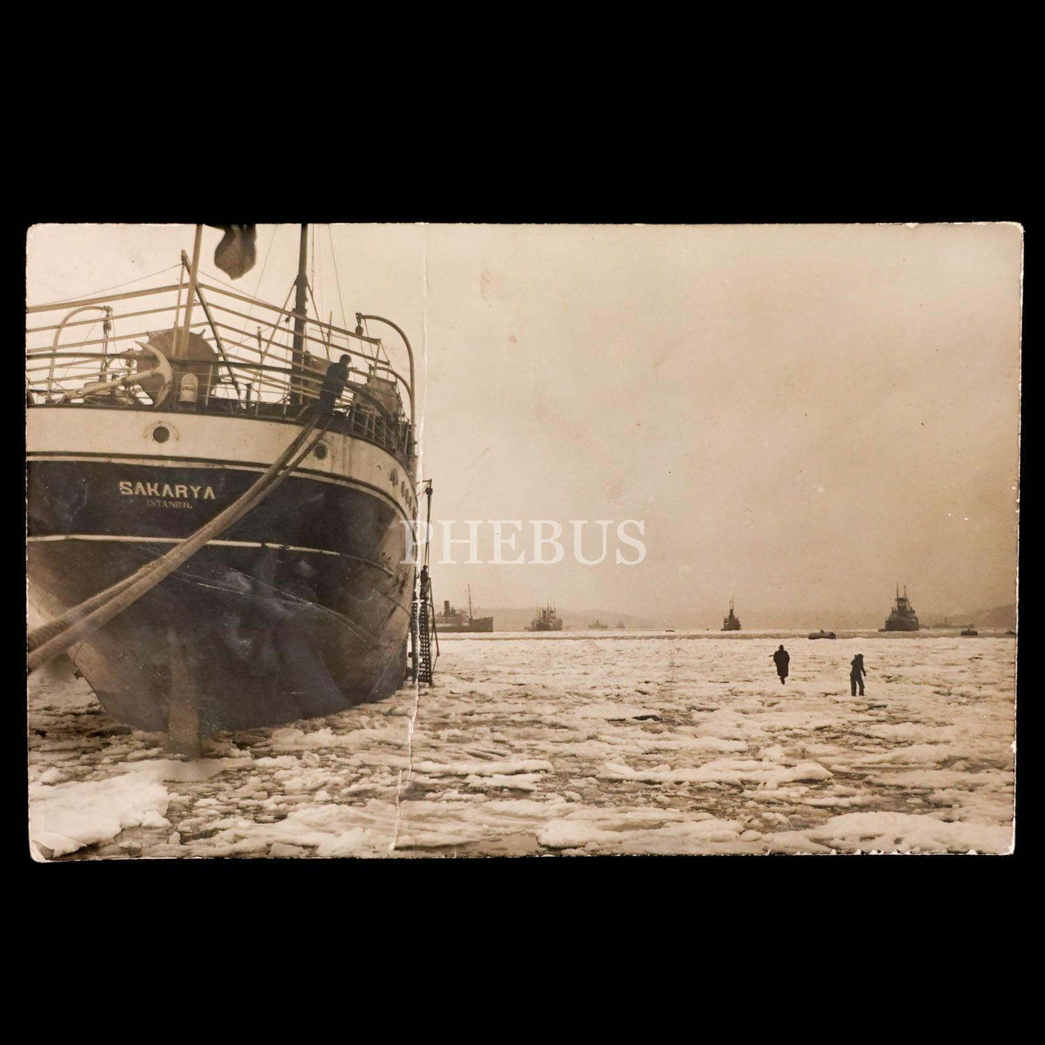Meşhur 1929 Kışı´nda Tuna Nehri´nden koparak Boğaziçi´ni istila eden buz kütleleri üzerinde yürüyüş yapan insanlar ve zorunlu demir atmış Sakarya gemisi, ed. Foto W. Sender, 14x9 cm...