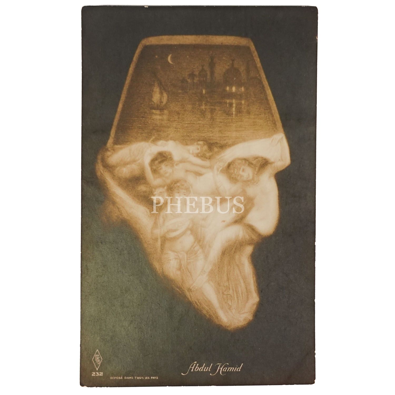 Sultan İkinci Abdülhamid´in simasının nü kadınlarla tamamlandığı, kendisini kadın düşkünlüğüyle itham eden anti-propaganda kartpostalı, "Abdul Hamid", 9x14 cm...