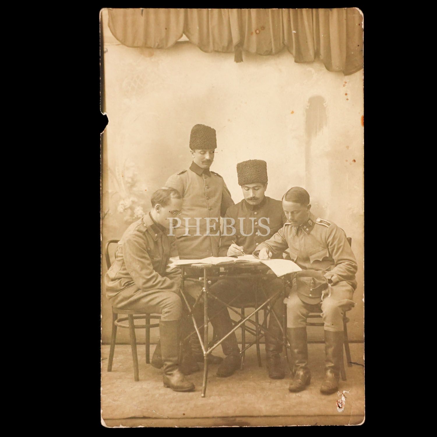 Cihan Harbi dönemi Osmanlı ve Alman subaylarının, harekat planını inceleme mizanseniyle aldırdıkları hatıra fotoğrafı, 9x14 cm...