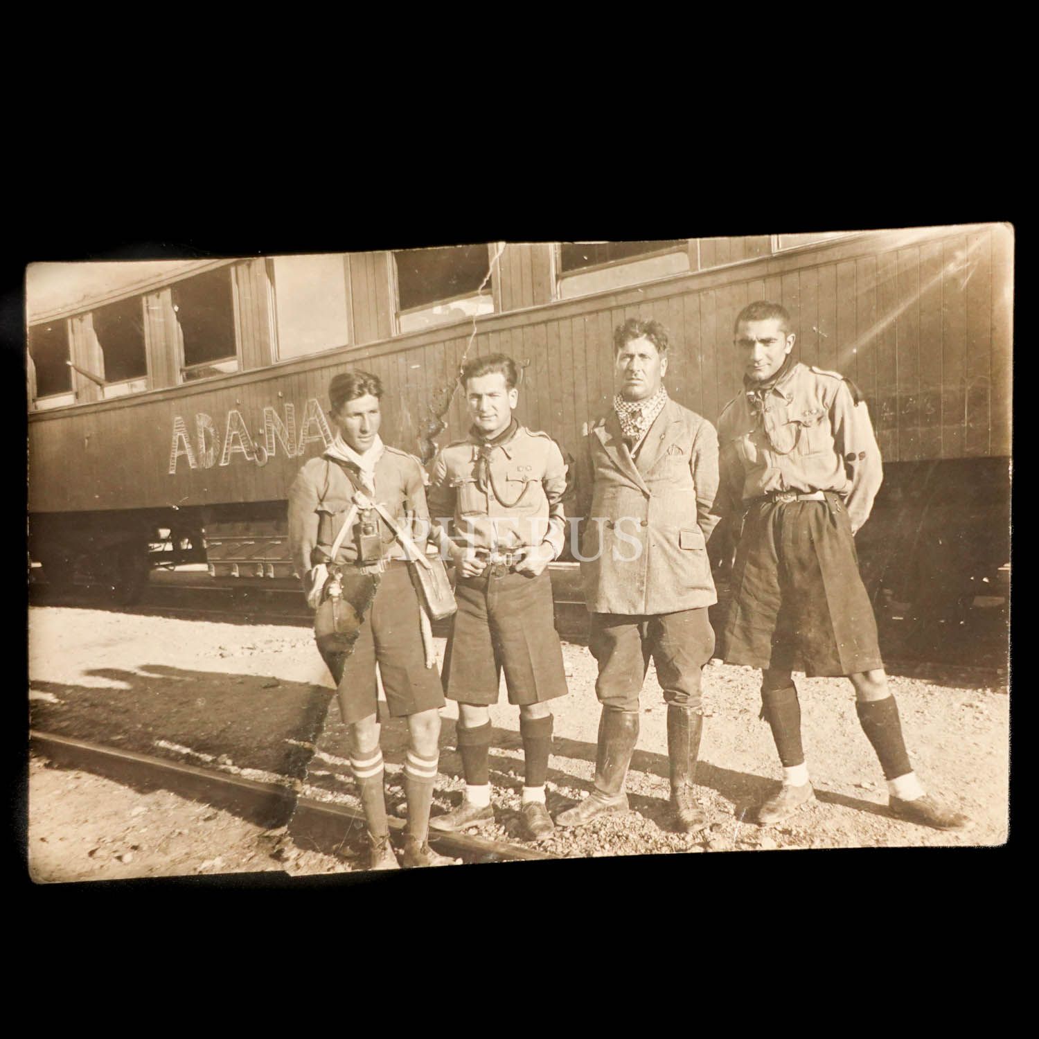 Adana yazılı tren önünde izciler, 14x9 cm...