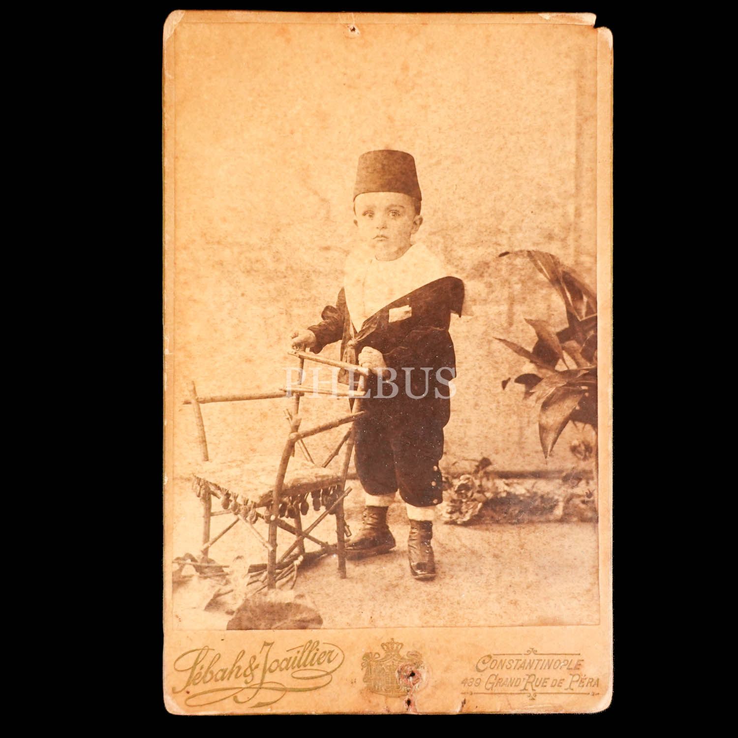 Denizci kostümlü küçük çocuğun, Sebah&Joaillier Fotoğrafhanesi´nde (Constantinople) çekilmiş kabin fotoğrafı, 11x17 cm...