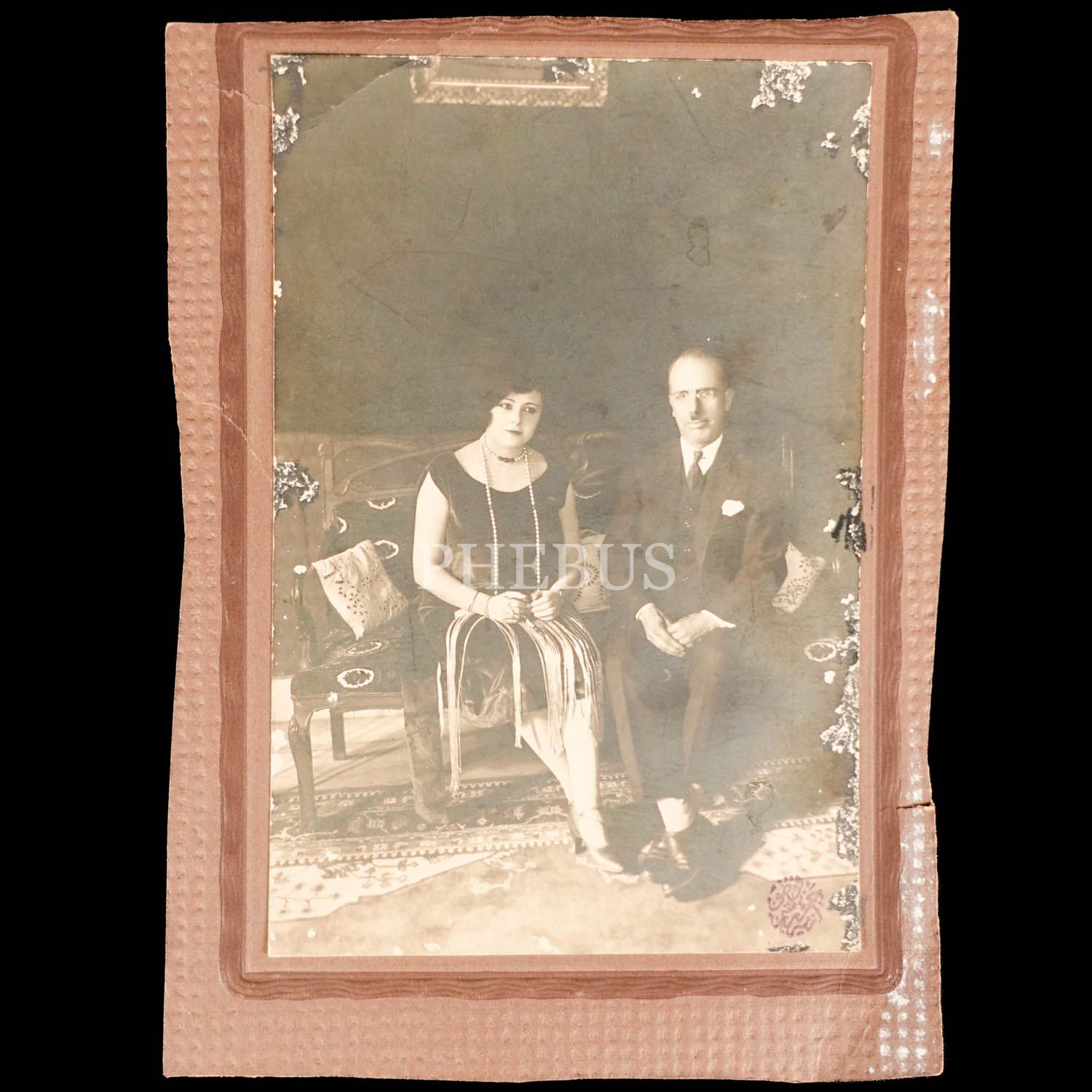 Şık giyimli hanımefendi ve beyefendinin stüdyo hatıra fotoğrafı, "Foto Hamza Rüstem - İzmir", 14x19 cm...