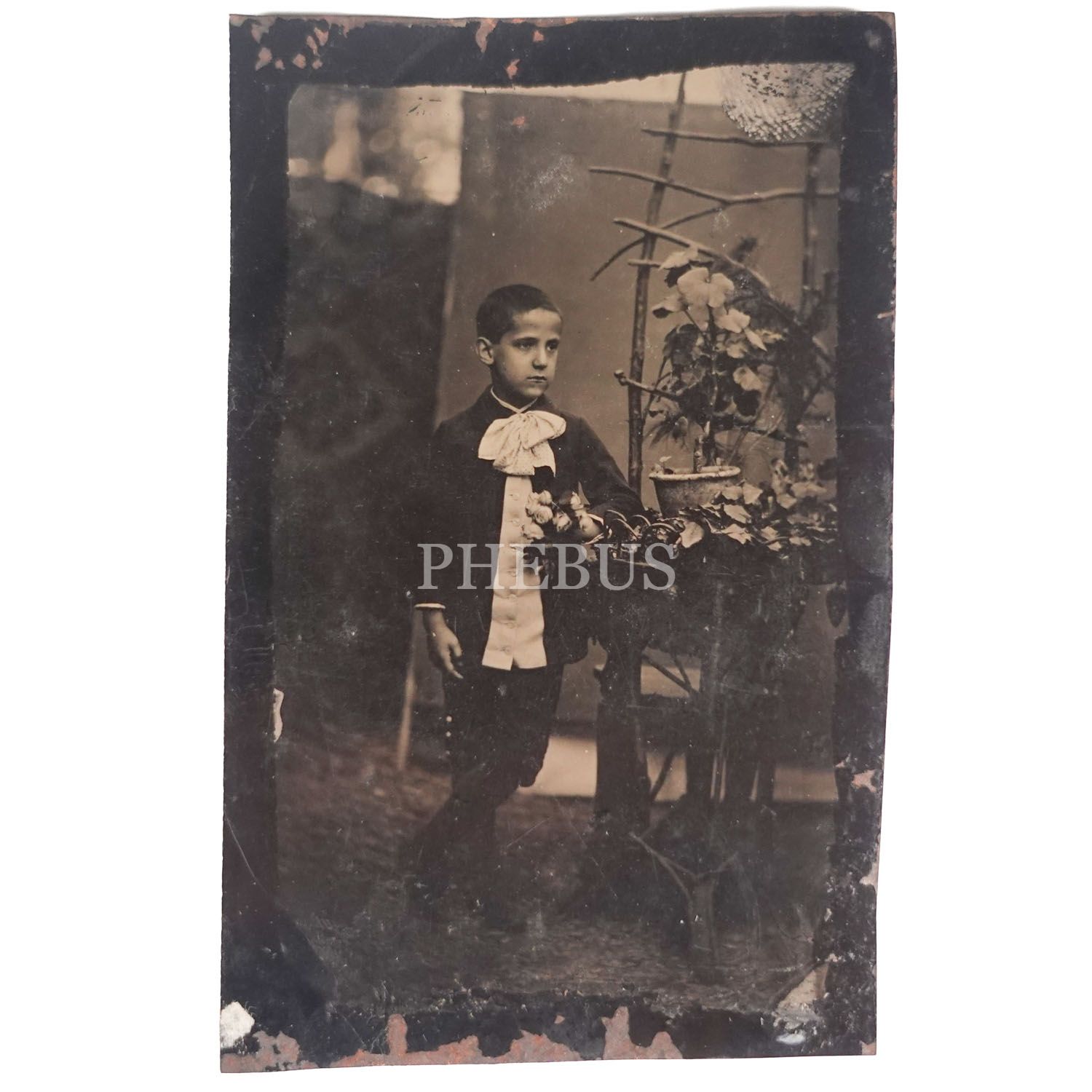 Bir erkek çocuğun, metal levha üzerine basılmış erken dönem stüdyo fotoğrafı, 6,5x10 cm...