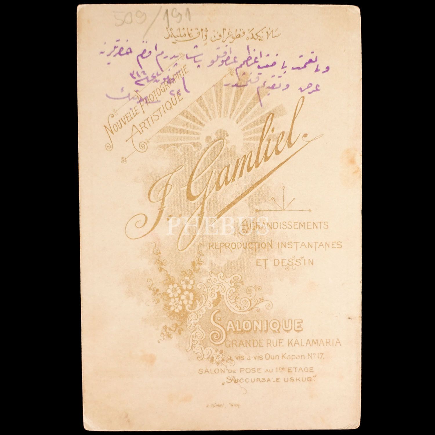 Bir subayın, F. Gamliel Fotoğrafhanesi´nde (Salonique [Selanik]) aldırdığı kabin fotoğraf, 11x17 cm...