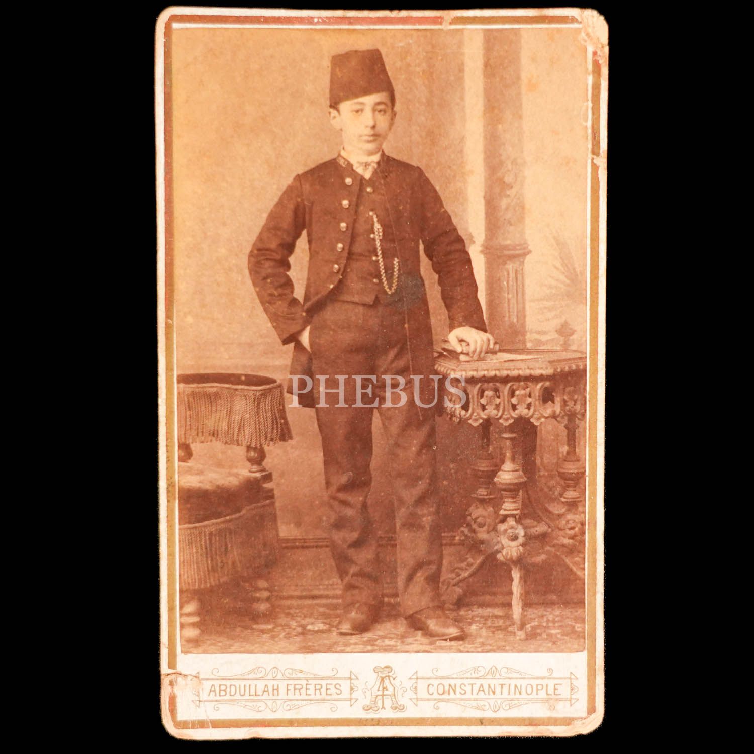 Kitaplarla poz veren bir talebenin, Abdullah Freres Fotoğrafhanesi´nde (Constantinople) aldırdığı CDV (kartvizit) boy hatıra fotoğrafı, 6,5x11 cm...