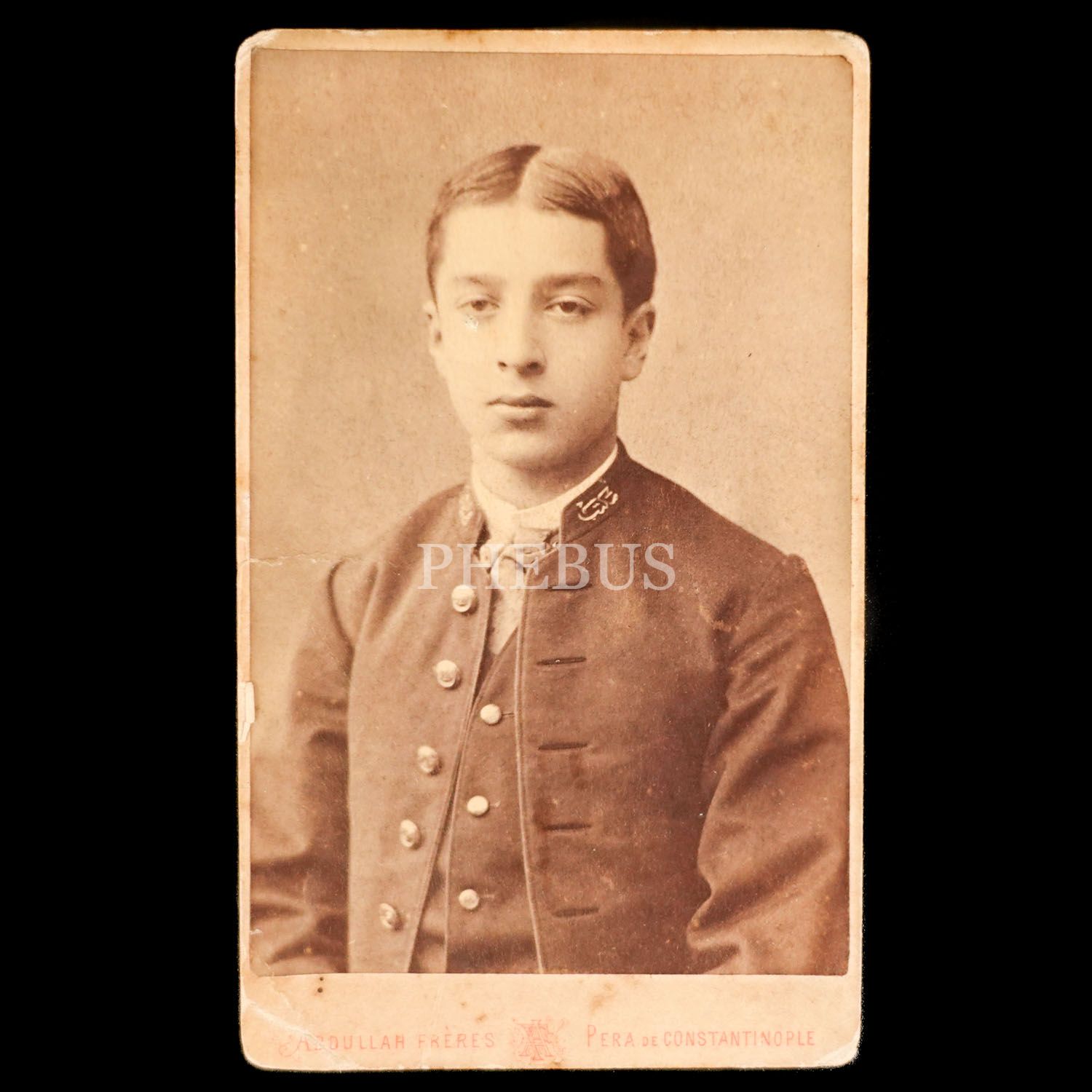 Bir öğrencinin mektep üniformasıyla, Abdullah Freres Fotoğrafhanesi´nde çektirdiği CDV (kartvizit) boy fotoğrafı, 7x11 cm...