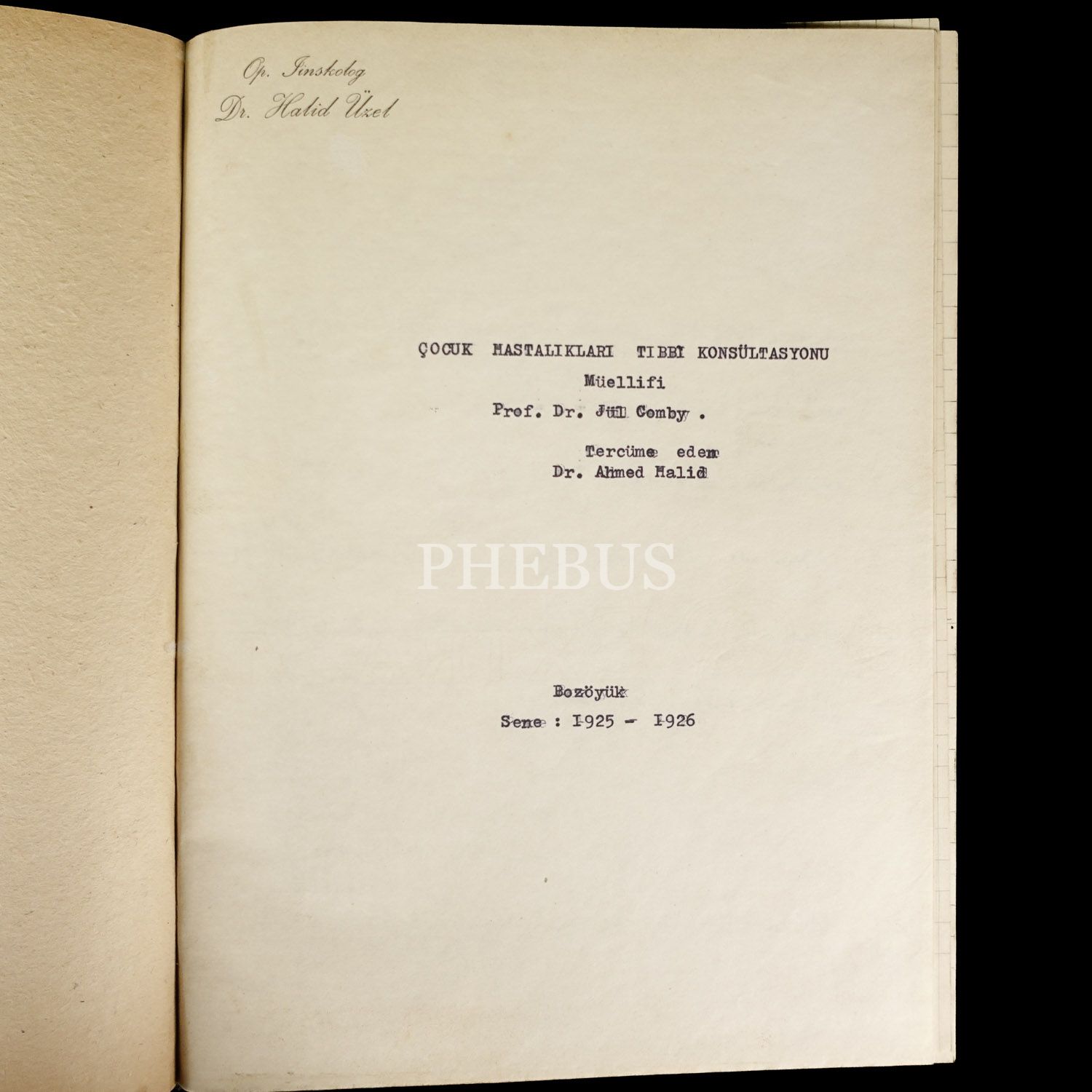 "ÇOCUK HASTALIKLARI TIBBİ KONSÜLTASYONU" başlıklı eserin el yazısı ile hazırlanmış nüshası, (müellifi: Jül Comby., çeviren: Ahmed Halid Üzel), 21x27 cm...