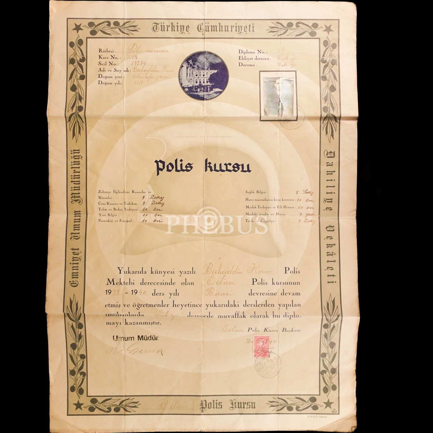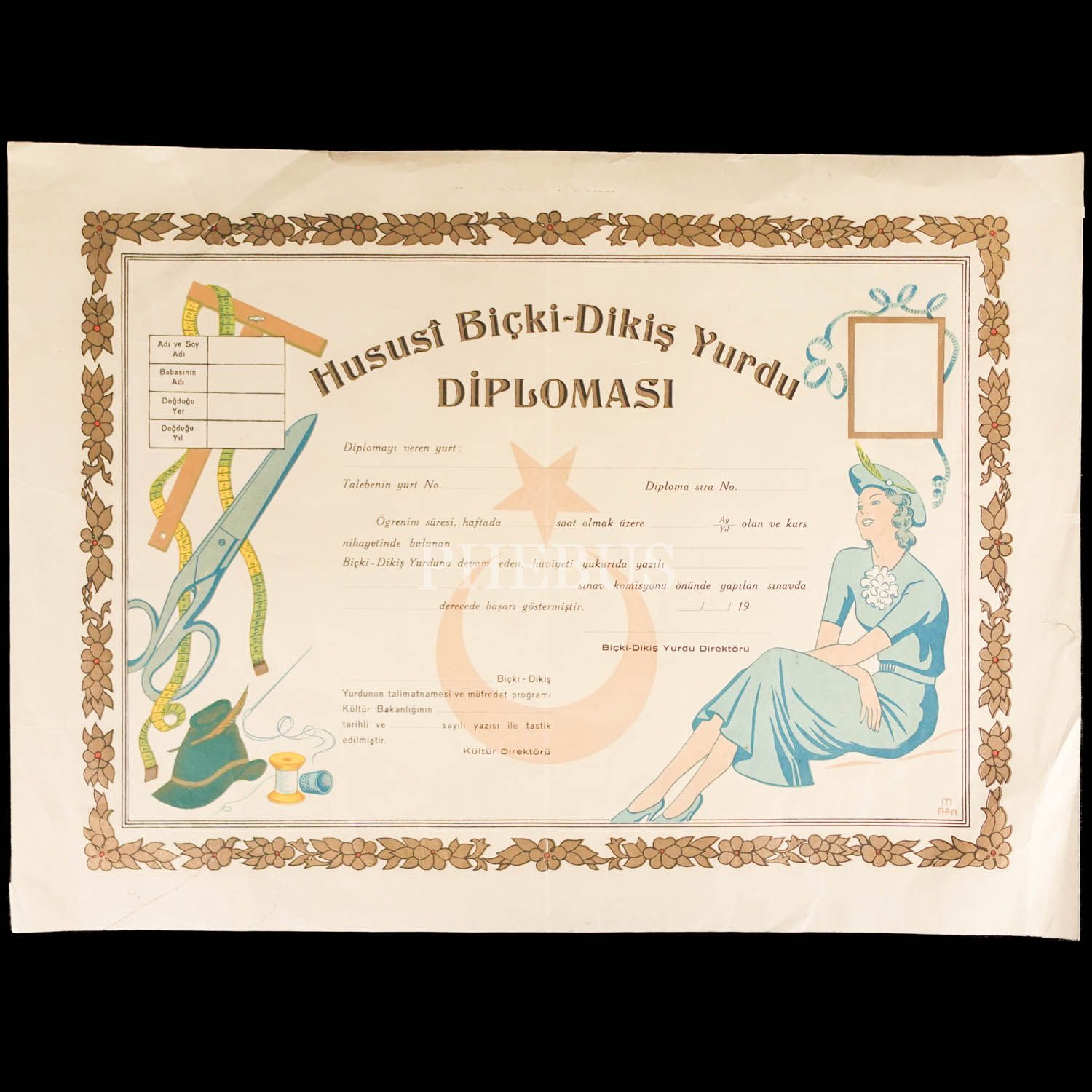 "Hususî Biçki-Dikiş Yurdu" başlıklı diploma, doldurulmamış, 33x43 cm...