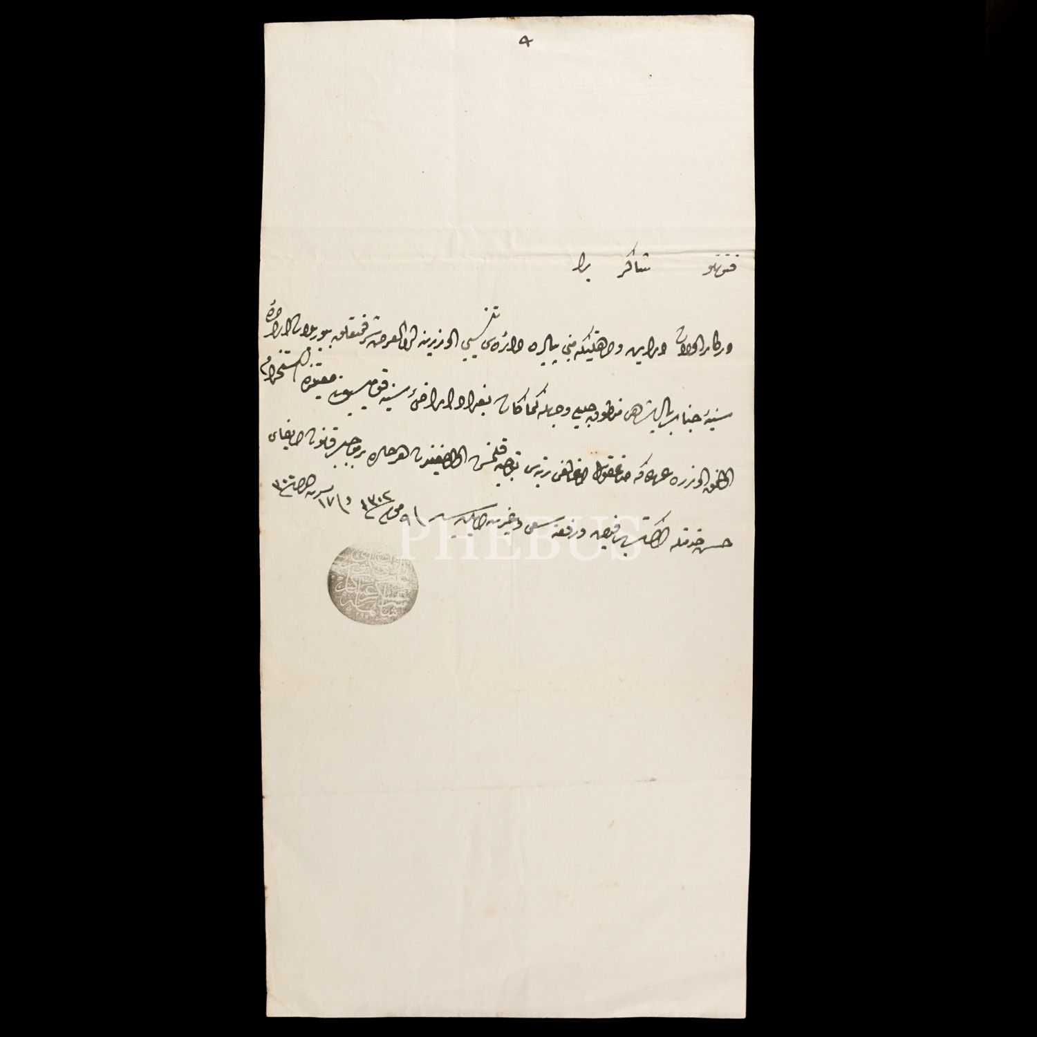 Bağdat Arazi-yi Seniyye Komisyonu´nda görevli Şakir Bey´in sağ kol ağalığı rütbesine tevcih edildiğine dair Gazi Osman Paşa´nın mührünü taşıyan evrak, 1306, 19x38 cm...