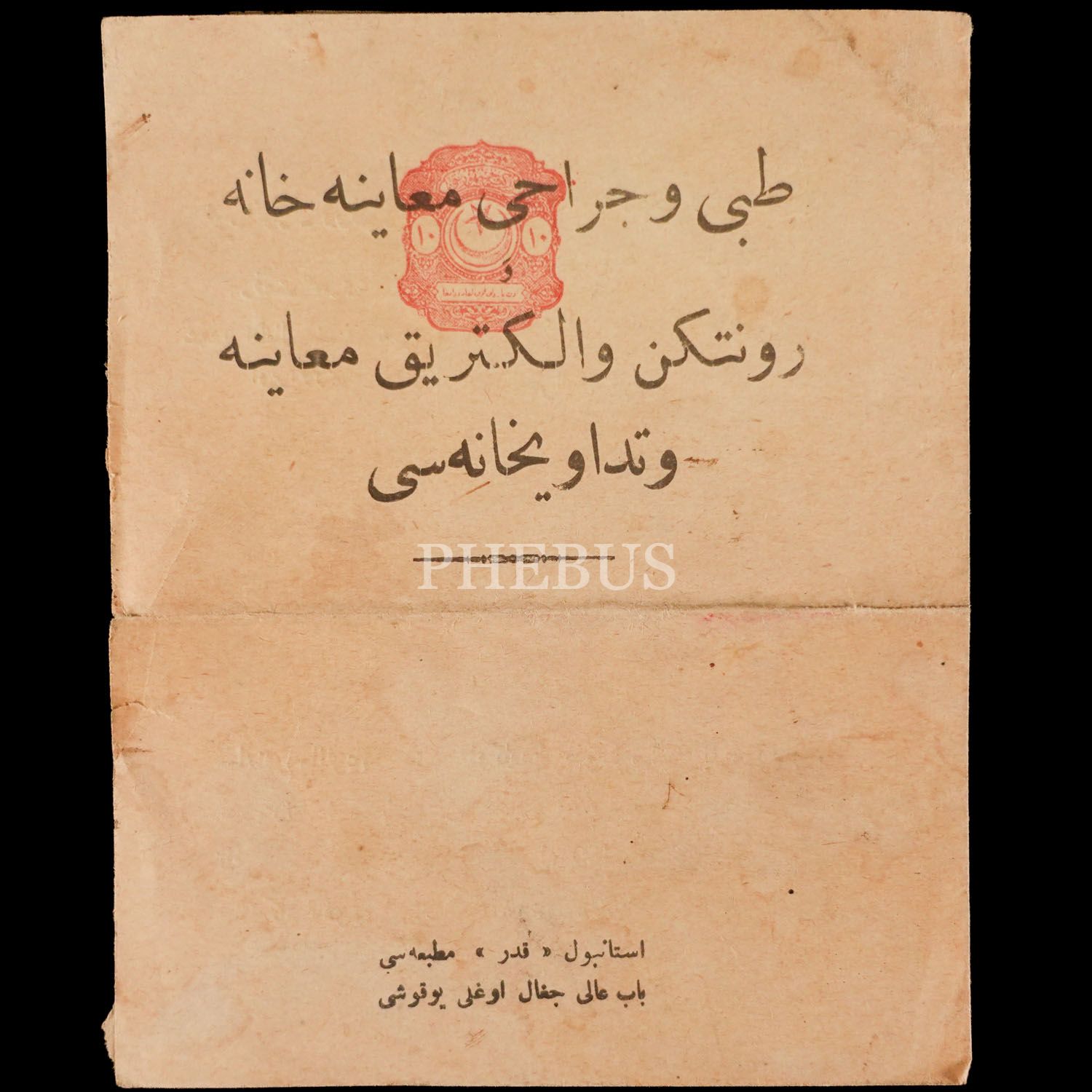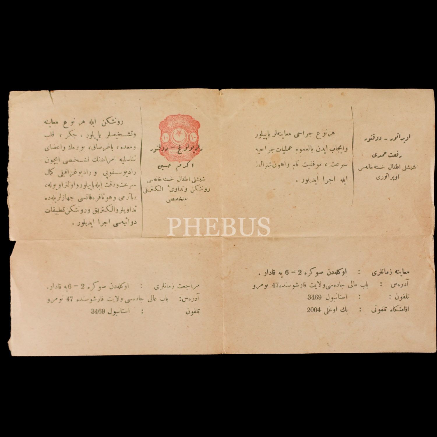 Operatör Doktor Rafet Hamdi ve Radyolog Ekrem Hüseyin´in muayehanesinin el ilanı, "Tıbbi ve Cerrahi Muayenehane - Röntgen ve Elektrik Muayene ve Tedavihanesi", 23x15 cm...