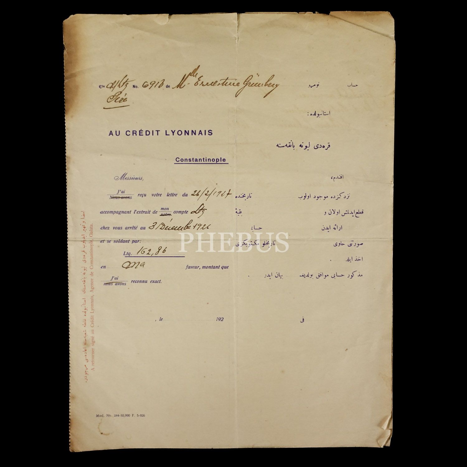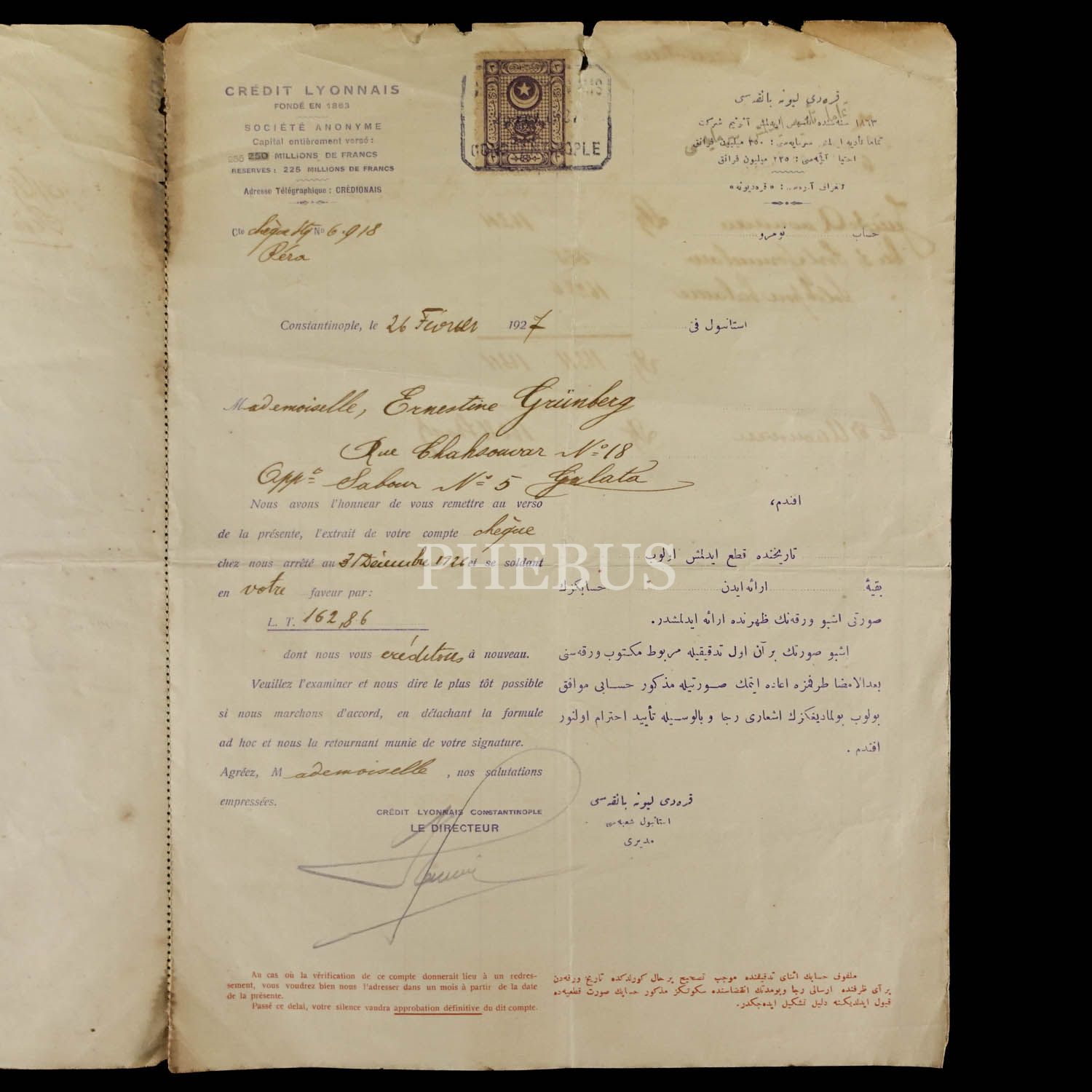 Credit Lyonnais (Constantinople) antetli, 2 yapraklı evrak, 1927, 22x29 cm...