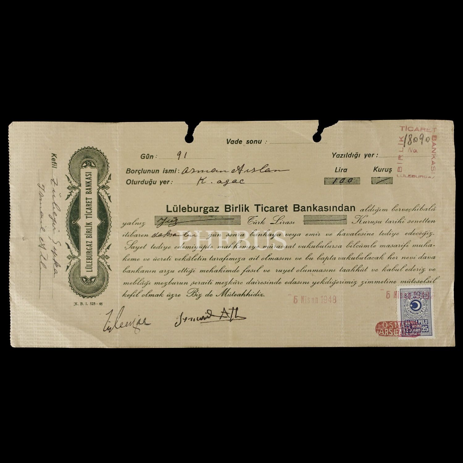 Lüleburgaz Birlik Ticaret Bankası makbuzu, 6 Nisan 1948 damgalı, Damga Pullu, 28x14 cm...