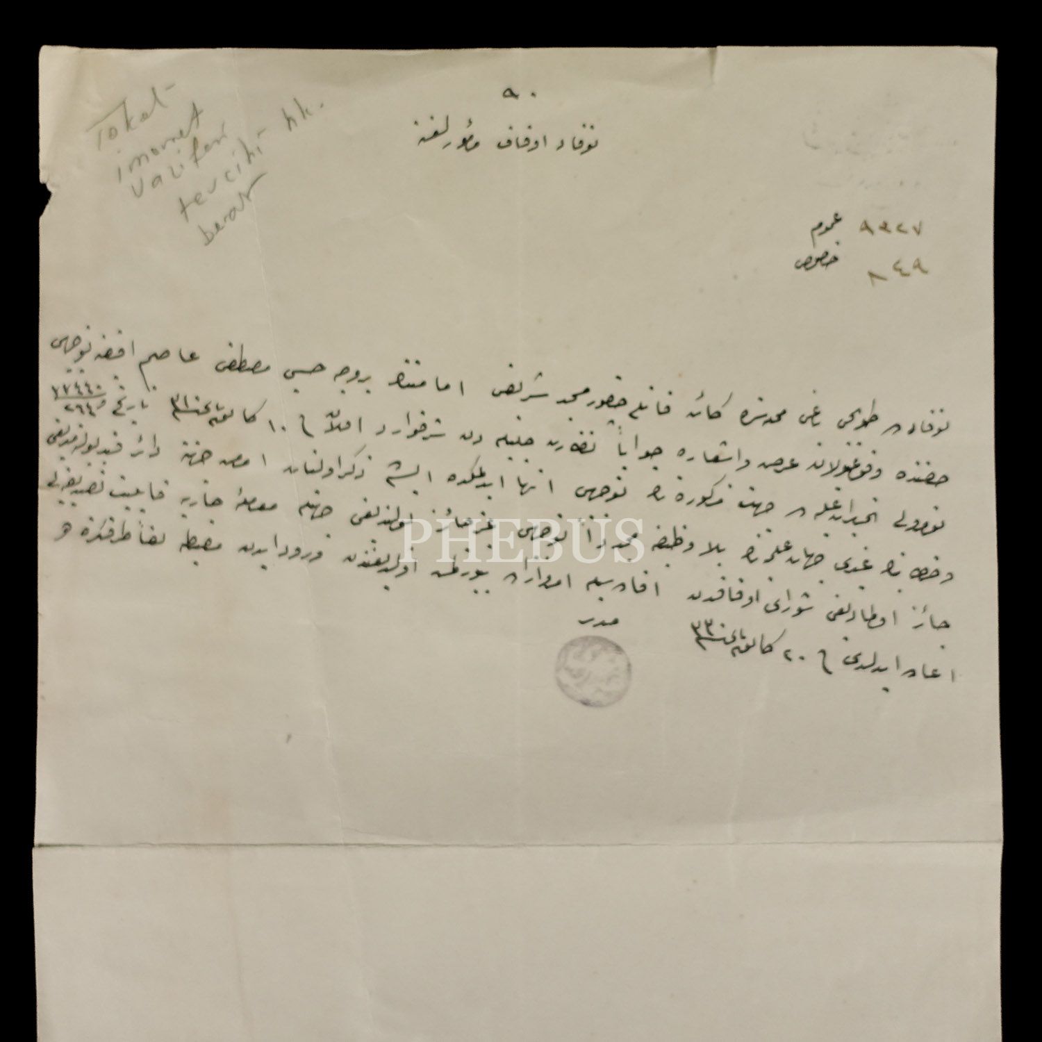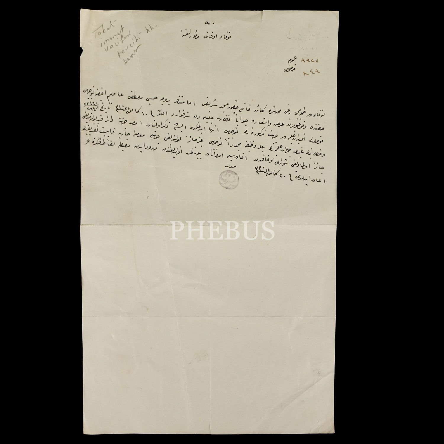 Tokat Evkaf Müdürlüğüne hitaben kaleme alınmış, Kanlıçukur Mescid-i Şerifine Mustafa Asım Efendi´nin imam tayin edilmesi konule evrak, 20x33 cm...
