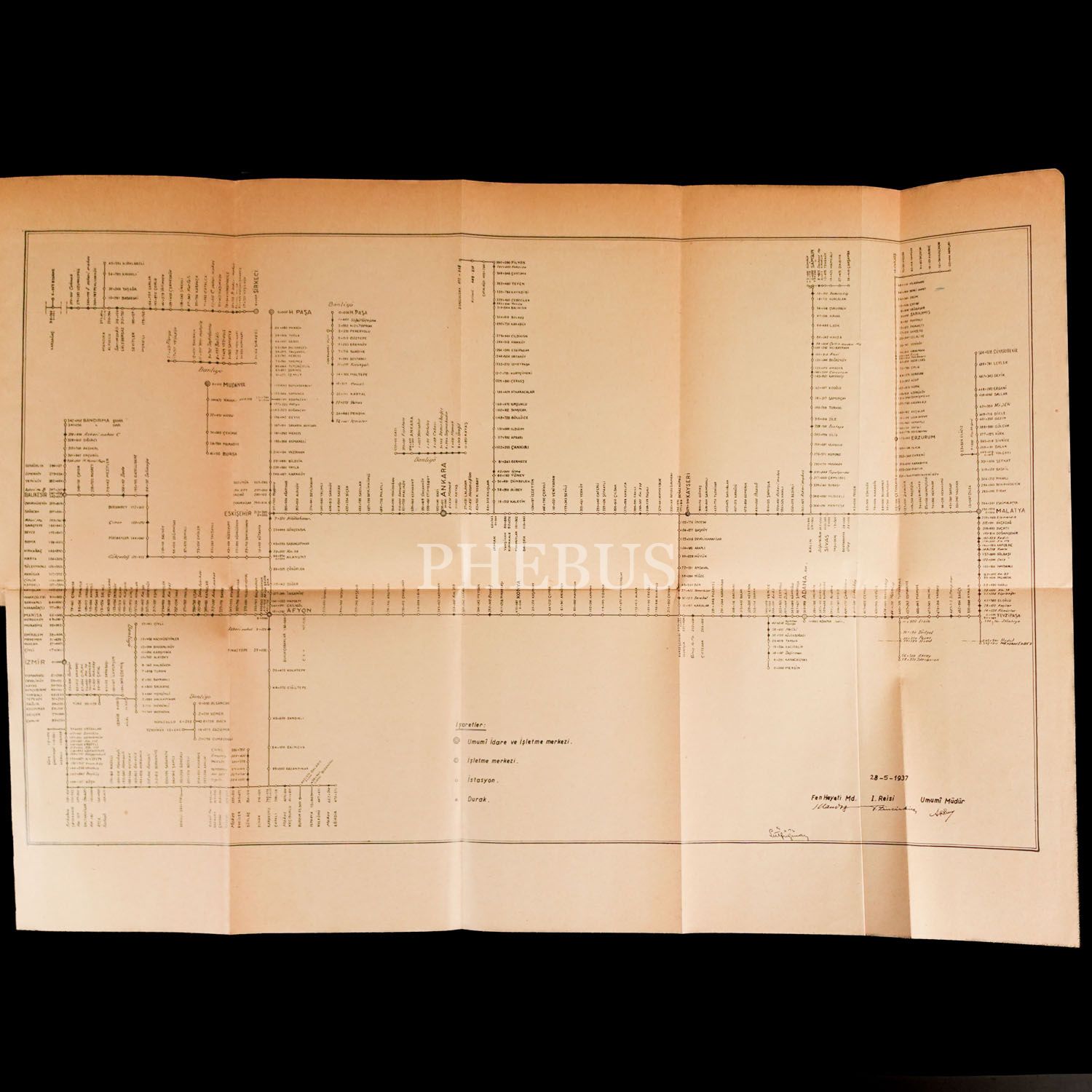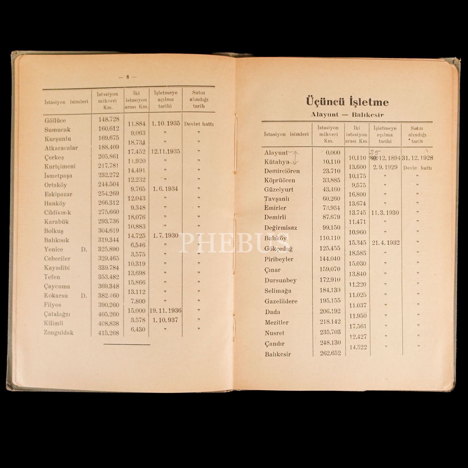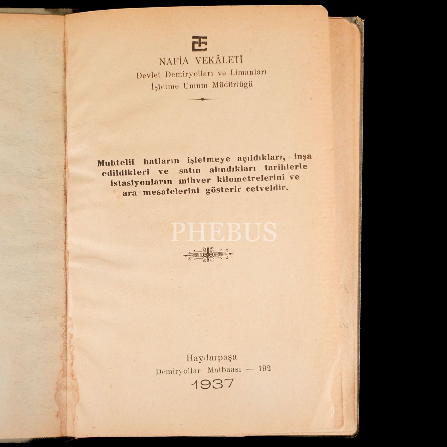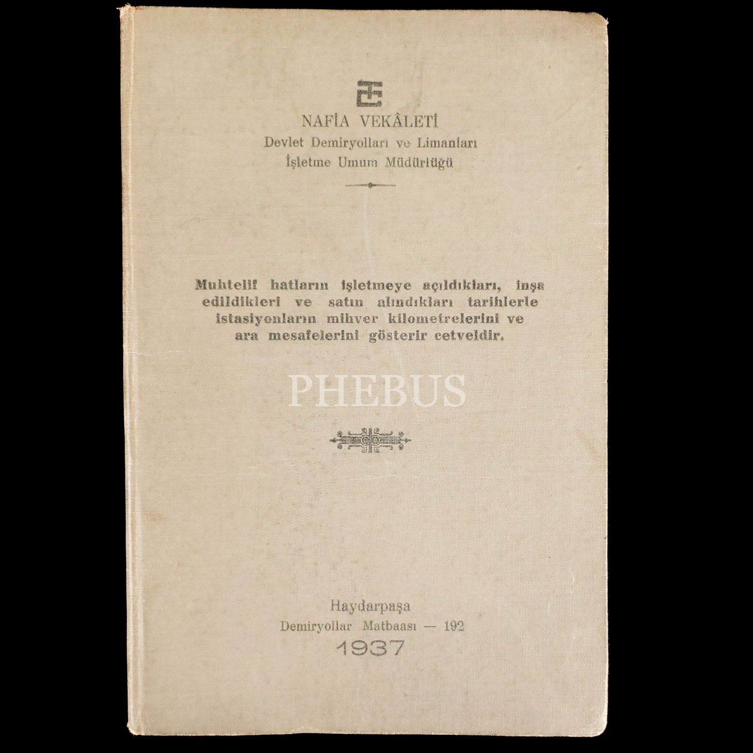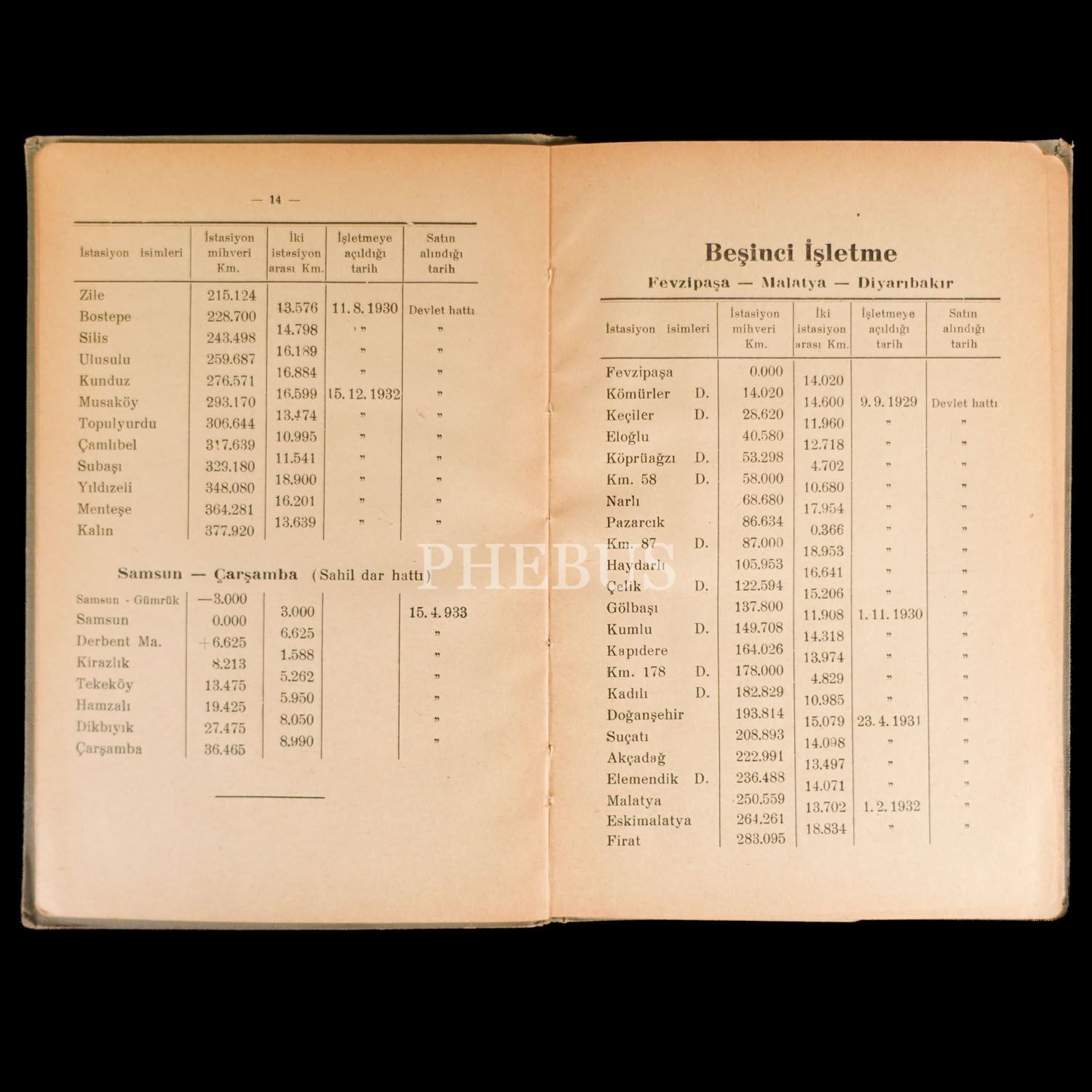 MUHTELİF HATLARIN İŞLETMEYE AÇILDIKLARI, İNŞA EDİLDİKLERİ VE SATIN ALINDIKLARI TARİHLERLE İSTASİYONLARIN MİHVER KİLOMETRELERİNİ VE ARA MESAFELERİNİ GÖSTERİR CETVELDİR, T.C. Nafia Vekâleti Devlet Demiryolları ve Limanları İşletme Umum Müdürlüğü, 1937, Demiryollar Matbaası (Haydarpaşa), 40 sayfa, 13x20 cm...