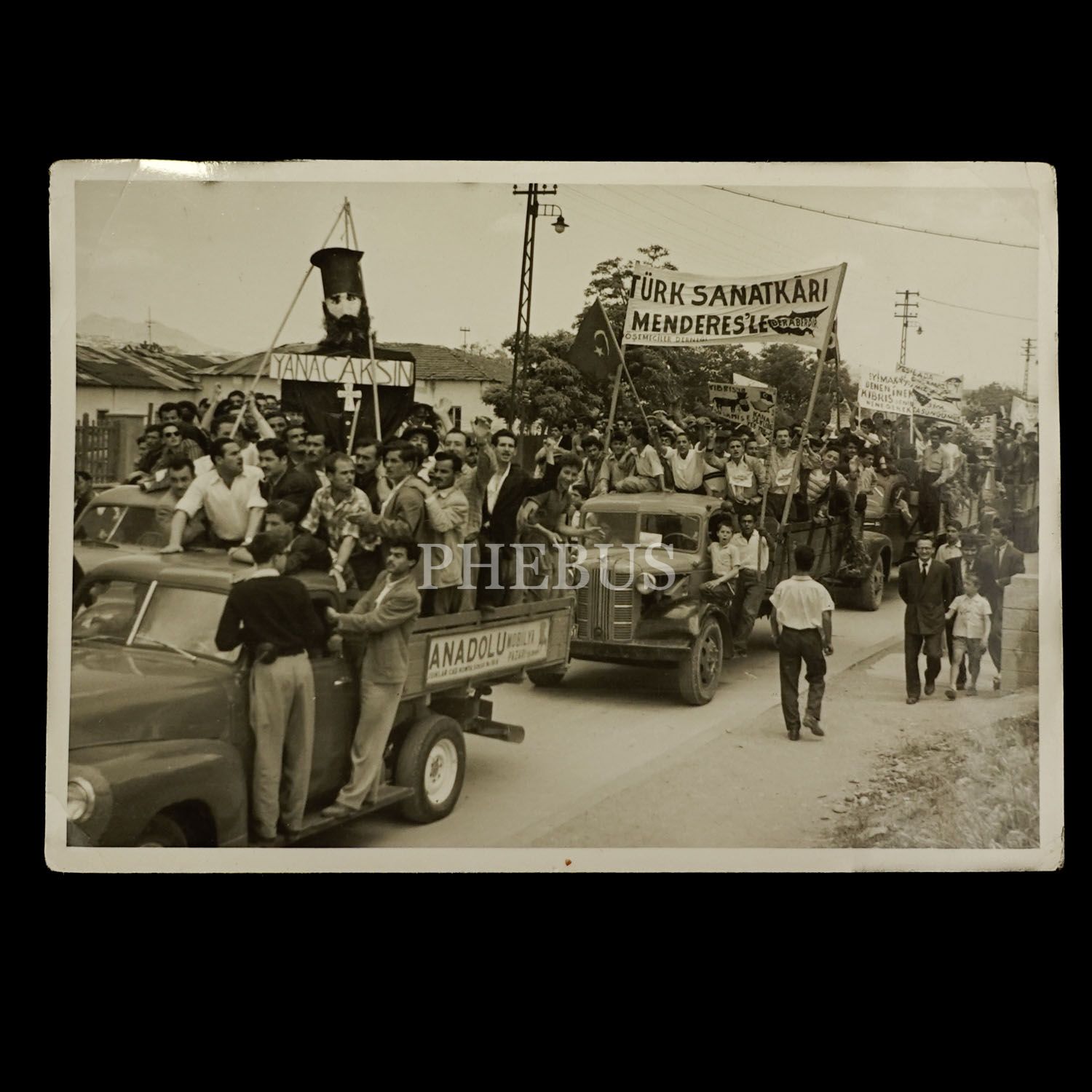 Kıbrıs Olayları sebebiyle gösteri yapan mobilya esnafları, "Yanacaksın", "Türk Sanatkârı Menderes´le Beraberdir", "Ey Makaryos Denen İnek, Kıbrıs Senin Nene Gerek" yazılı pankartlar dikkat çekmekte, 10x7 cm...