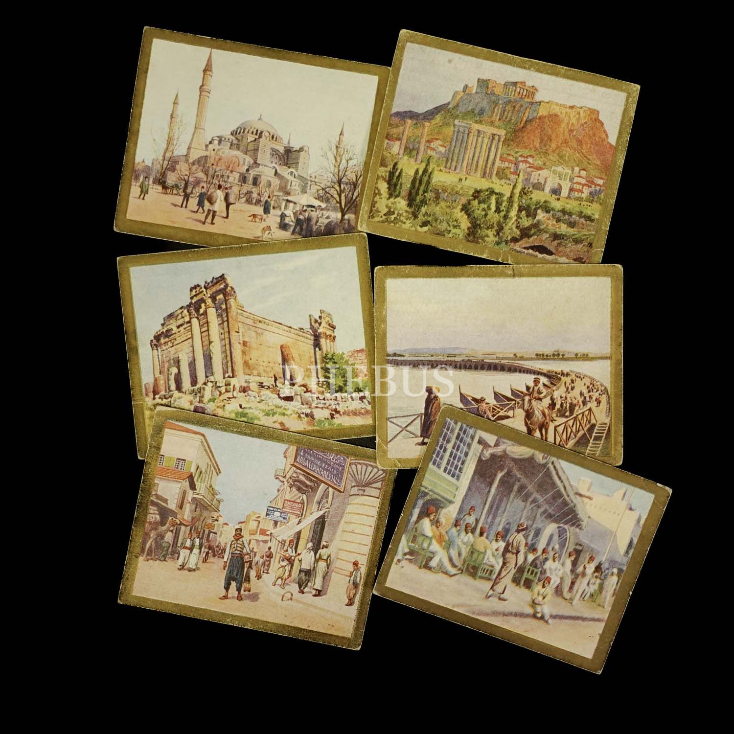 Osmanlı döneminden İstanbul (Ayasofya Camii) ve Bağdat (2 adet), Baalbek, Beyrut, Atina görselli sigara kartları (6 adet), 8x7 cm...