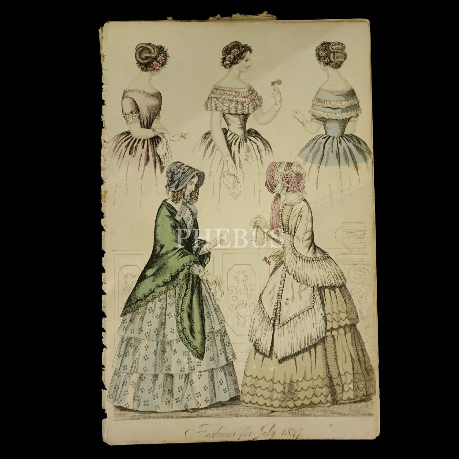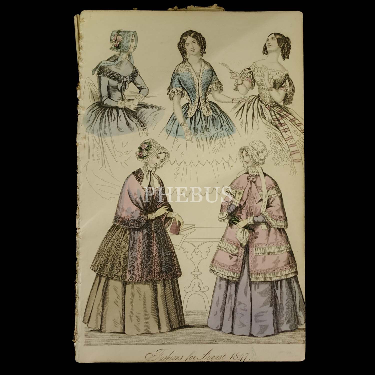1848 yılının yaz, sonbahar ve kış kadın modasını yansıtan renkli taş baskı model ve kıyafet çizimleri, 9 yaprak, 15x24 cm...