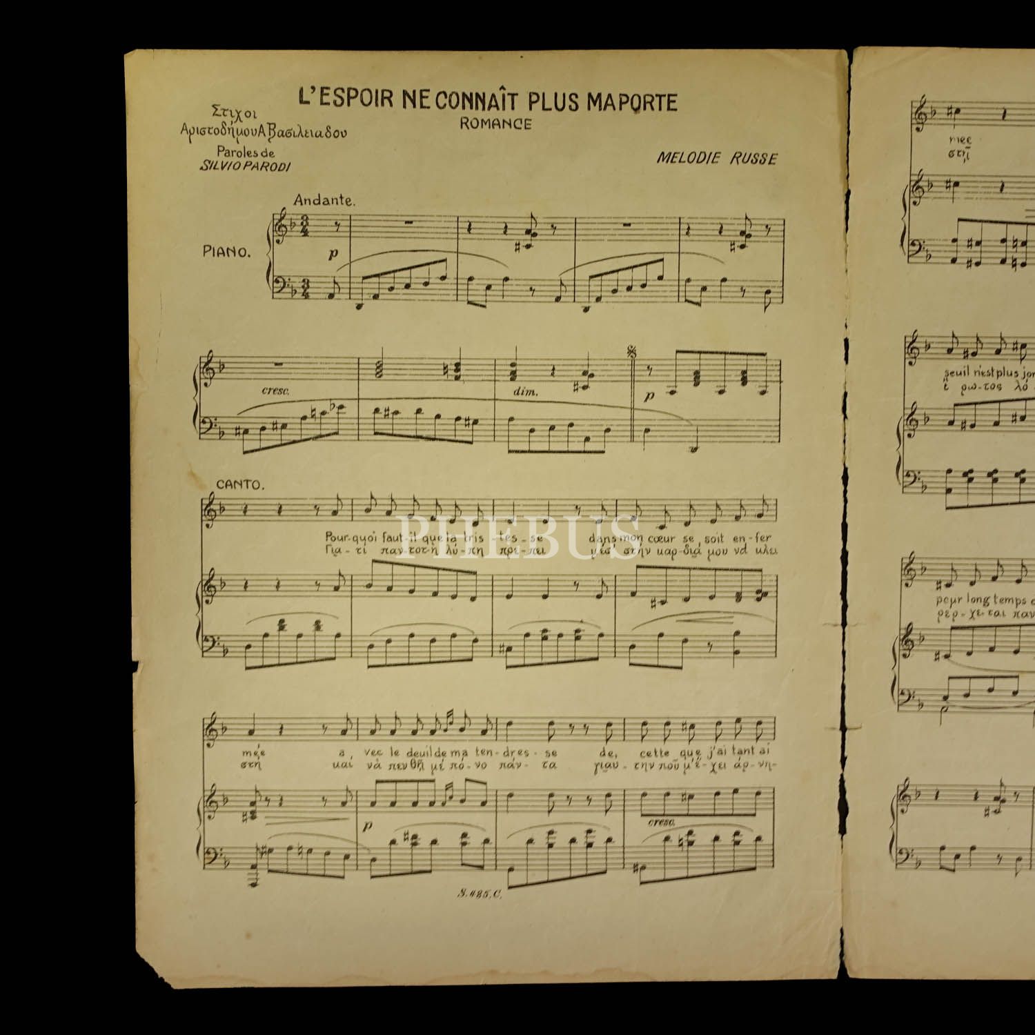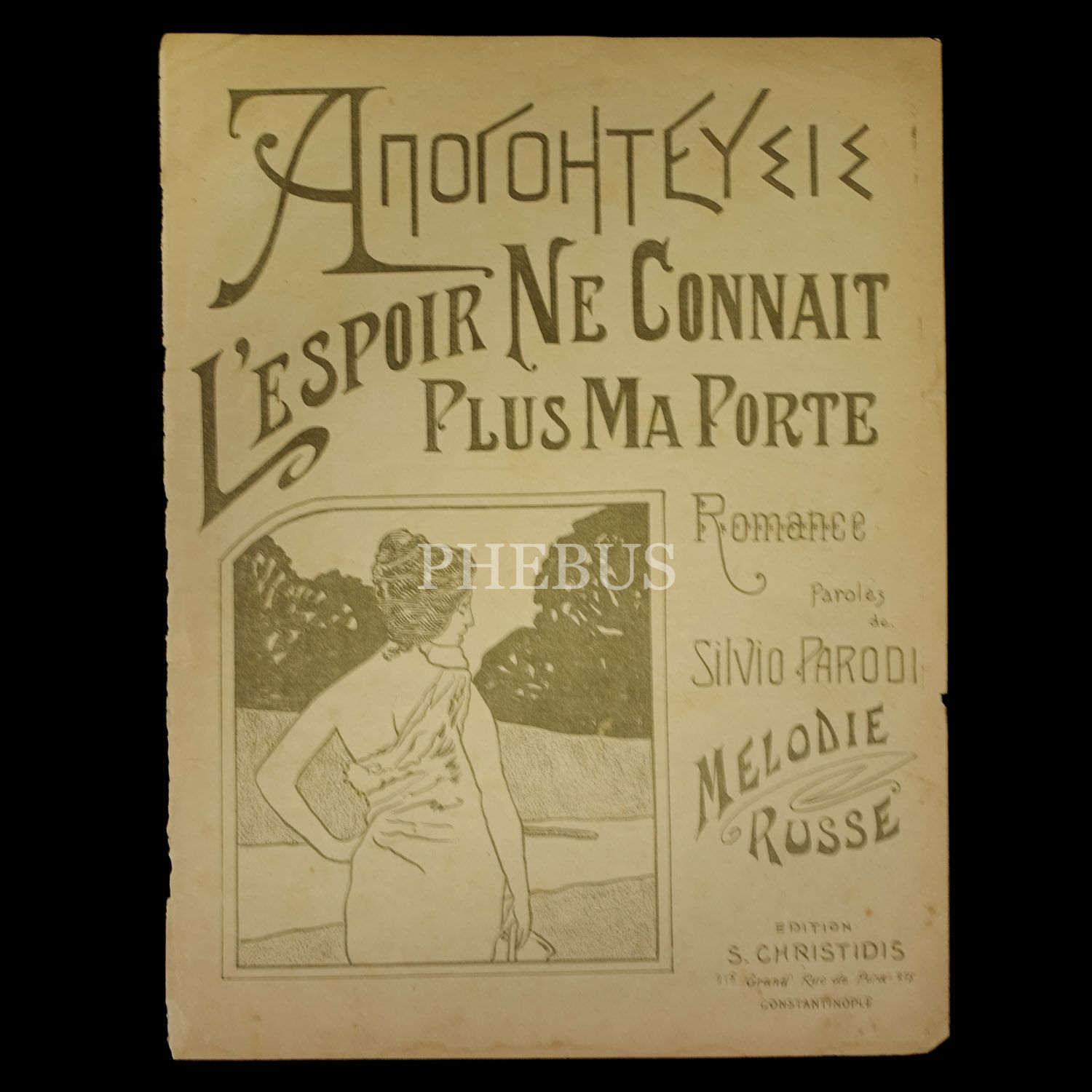 L´ESPOIR NE COMNAIT PLUS MAPORTE (Romance), Paroles de Silvio Parodi, ed. S. Christidis (Pera, Constantinople), 2 sayfa, 25x33 cm...