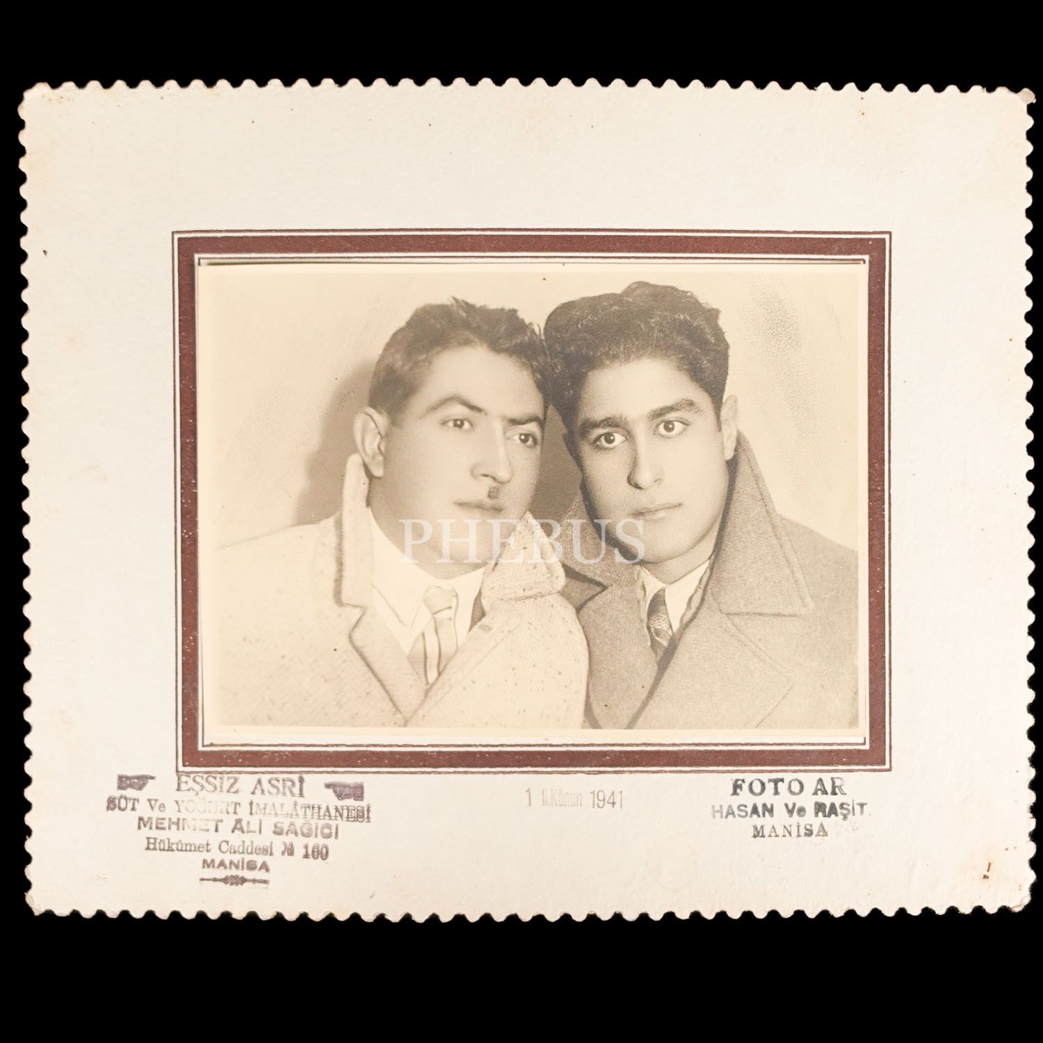 İki gencin, 1 İkinci Kanun 1941 tarihinde Foto Ar (Manisa)´da aldırdıkları hatıra fotoğrafı, paspartu üzerinde "Eşsiz Asrî Süt ve Yoğurt İmalâthanesi (Mehmet Âli Sağıcı) - Manisa" reklam kaşesi yer almaktadır, fotoğraf 18x13 cm, paspartu 27x22 cm...