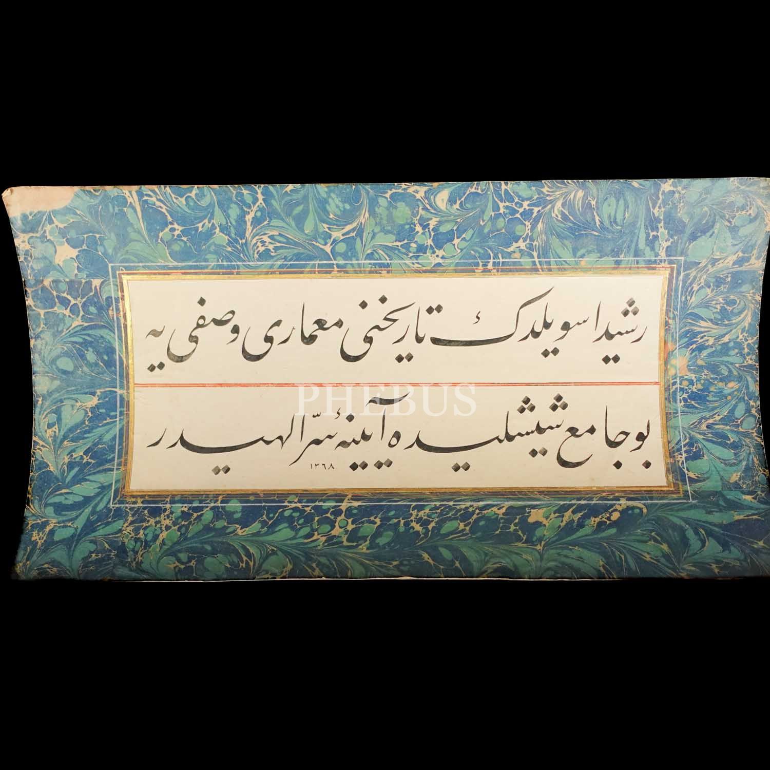 Şişli Camii´nin mimarı, Vakıflar Başmimarı Vasfi Egeli olup, bu hat eserindeki ilk mısarada adı geçmektedir. İkinci beyitteki harflerin ebced hesabı ile toplamı da Şişli Camii´nin inşa tarihi olan hicri 1367 (m. 1949)´a denk gelmektedir. İmza olmamasına rağmen hem şiir hem de yazı usta işidir. Hat altın cetvelli ve pervazında dönem ebrusu vardır.