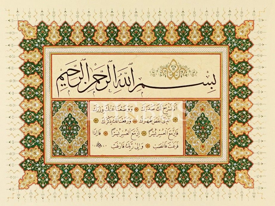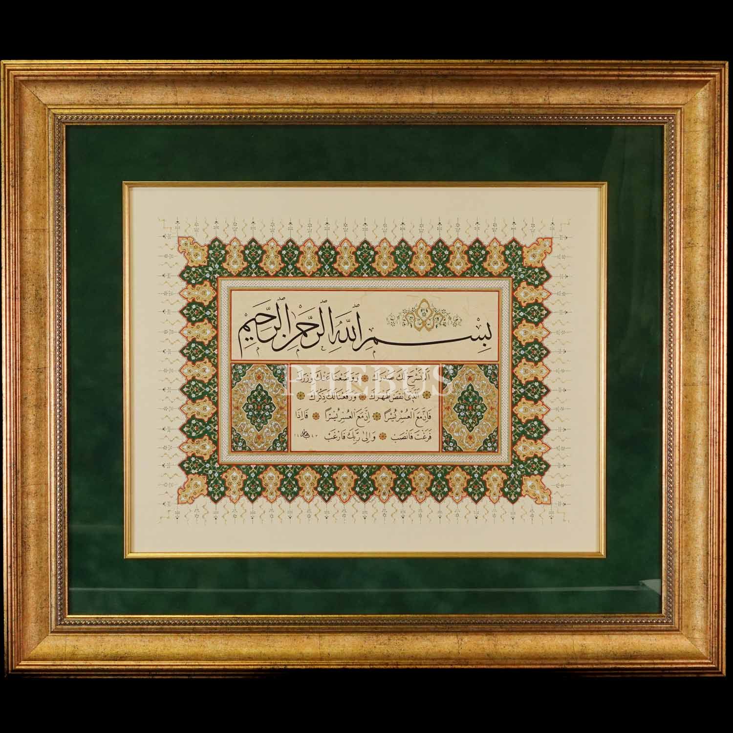 Oklu sülüs besmele ve nesih yazı ile yazılmış İnşirah Suresi, Bahar ketebeli Koltuklu levha, tezhip: Meryem Can, 1442 tarihli, çerçeve ölçü: 72x60 cm...