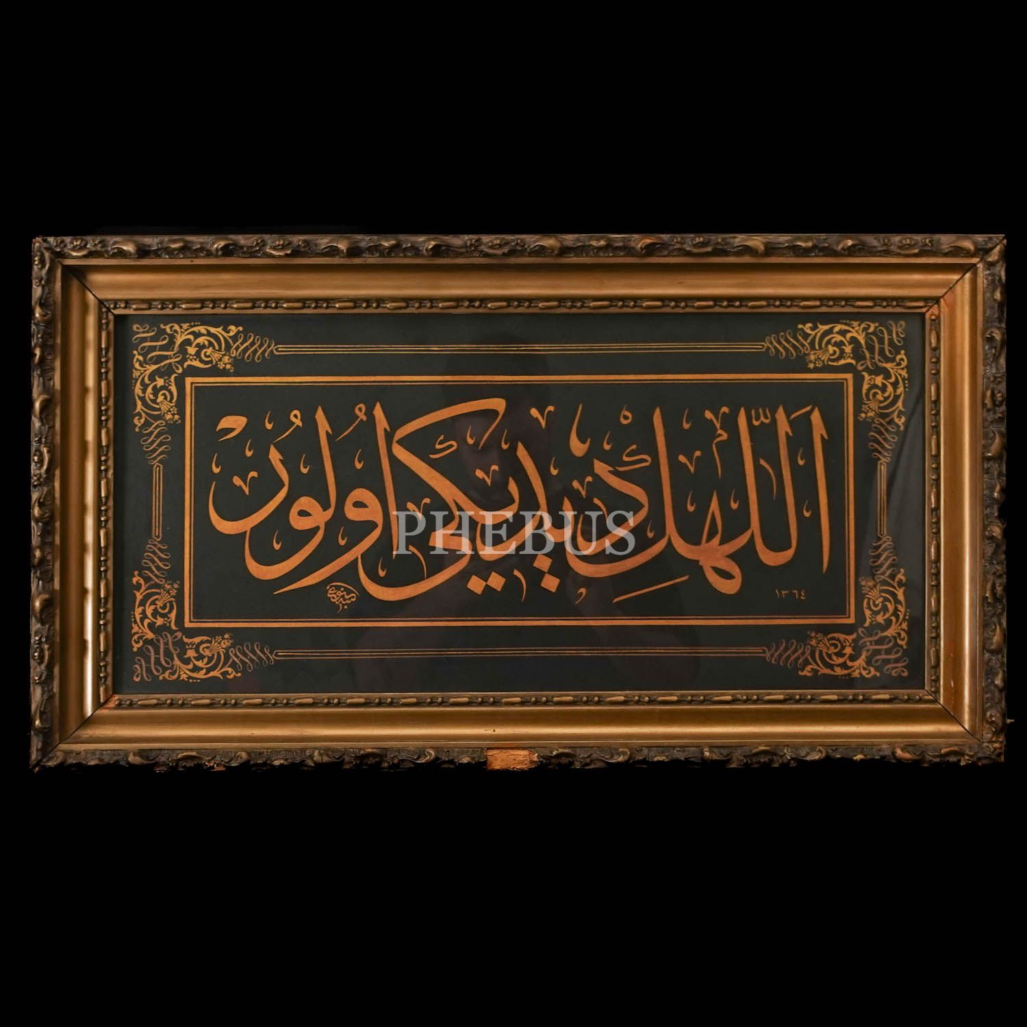 Beşiktaşlı Hacı Nuri Korman ketebeli, "Allah´ın dediği olur" celî sülüs zerendut yazı, 1364 tarihli, çerçeve ölçü: 72x39 cm...