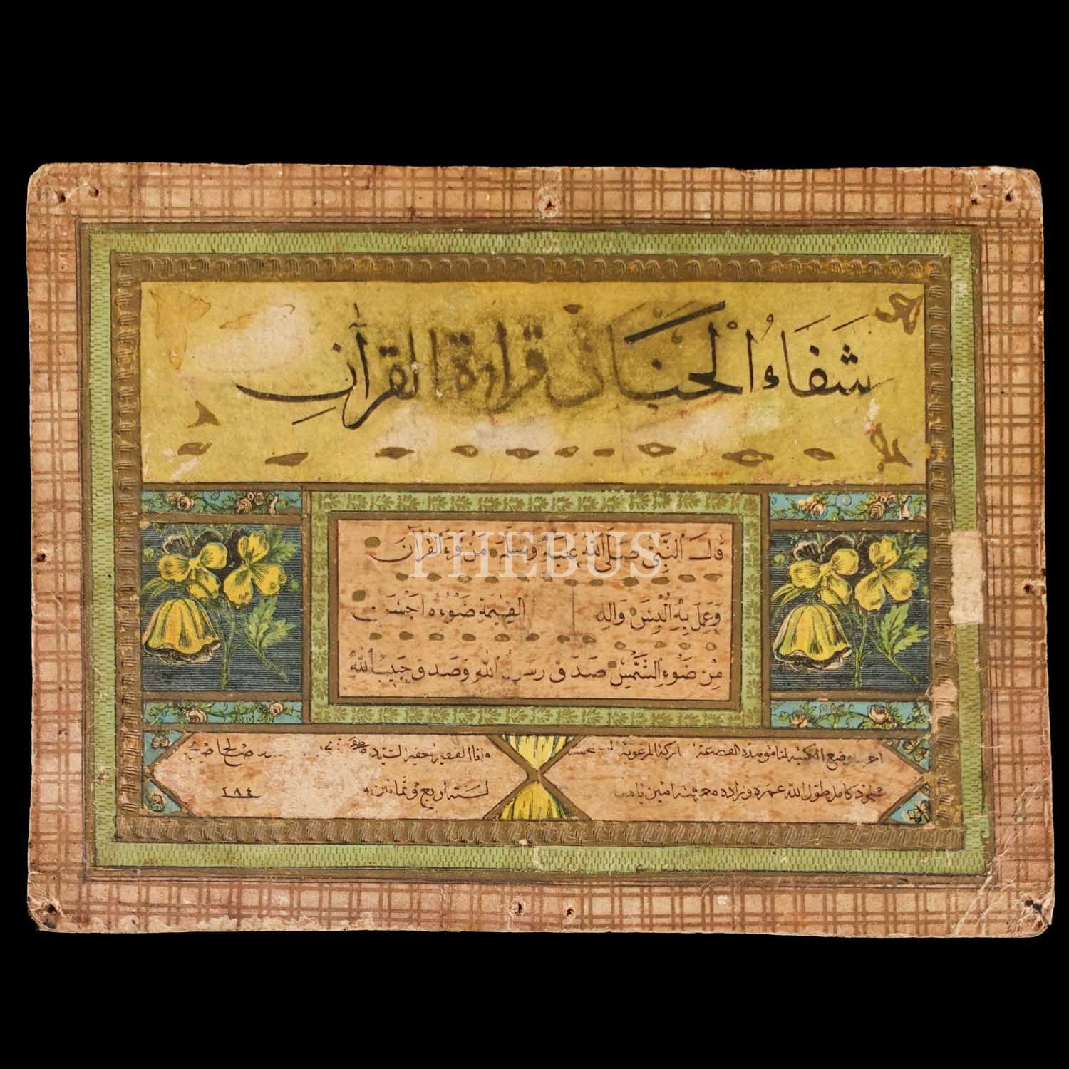 Nesih yazılı kısımdaki hadis-i şerif: "Kim Kuran´ı okur ve onunla amel ederse kıyamet günü ebeveynine güneşin parlaklığından daha parlak bir taç giydirilir."