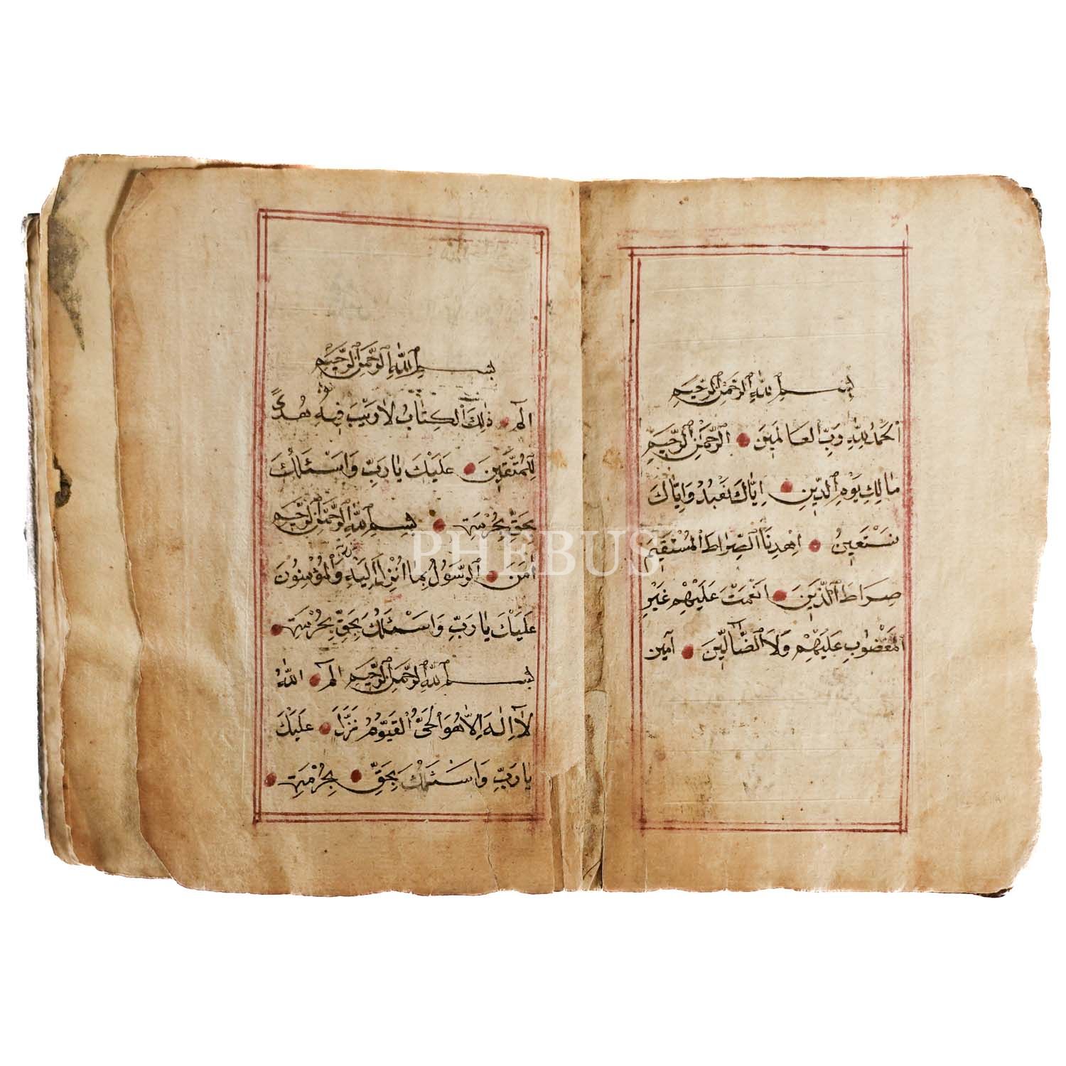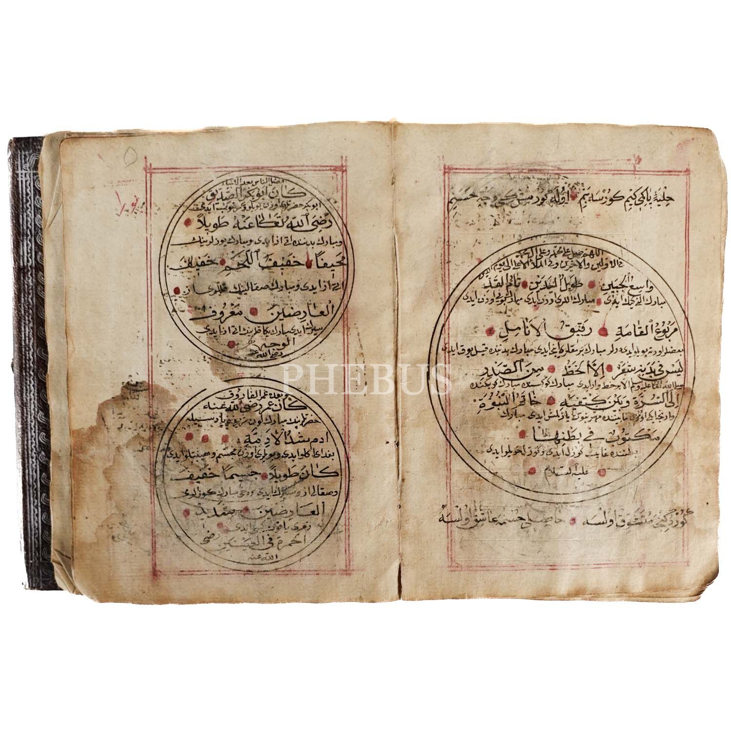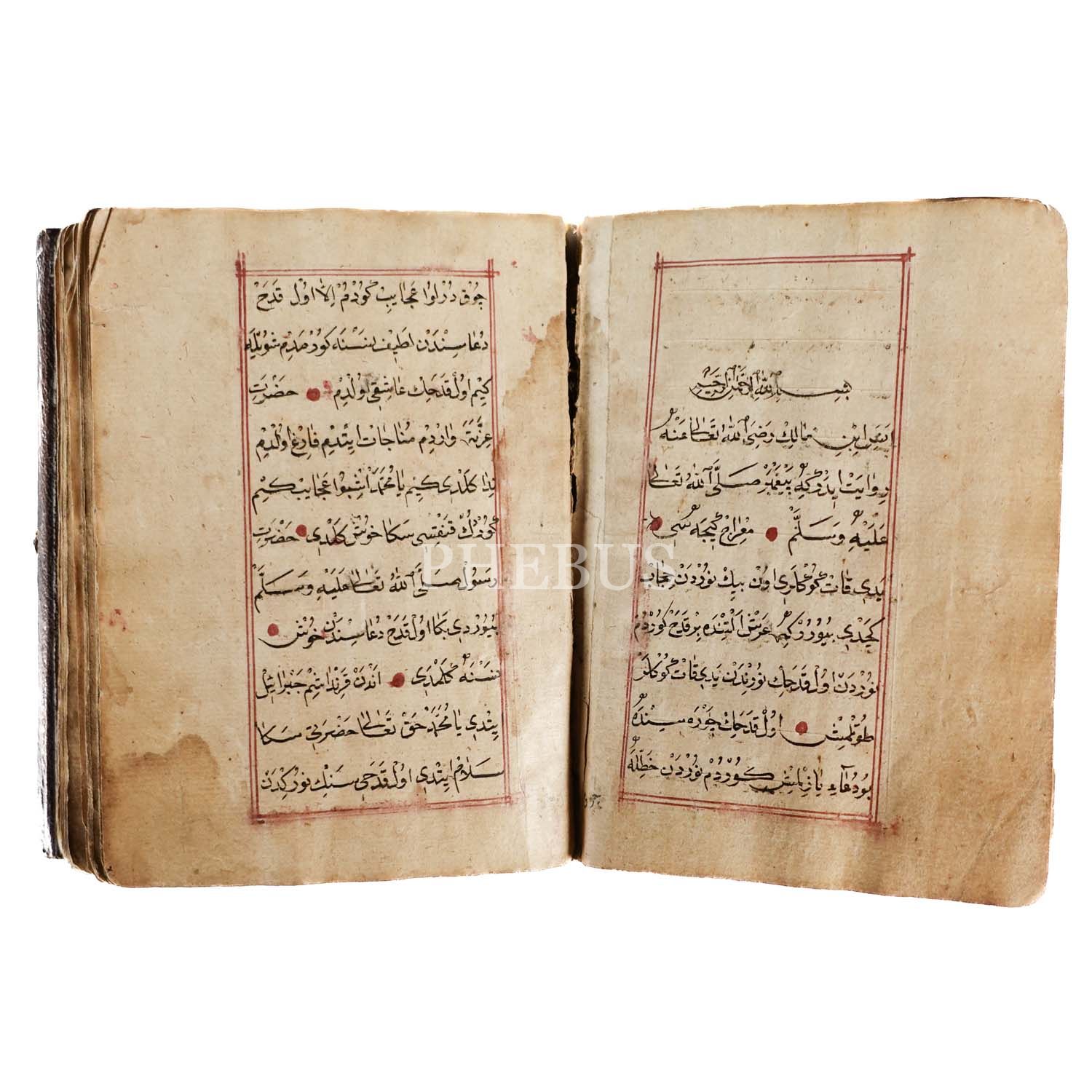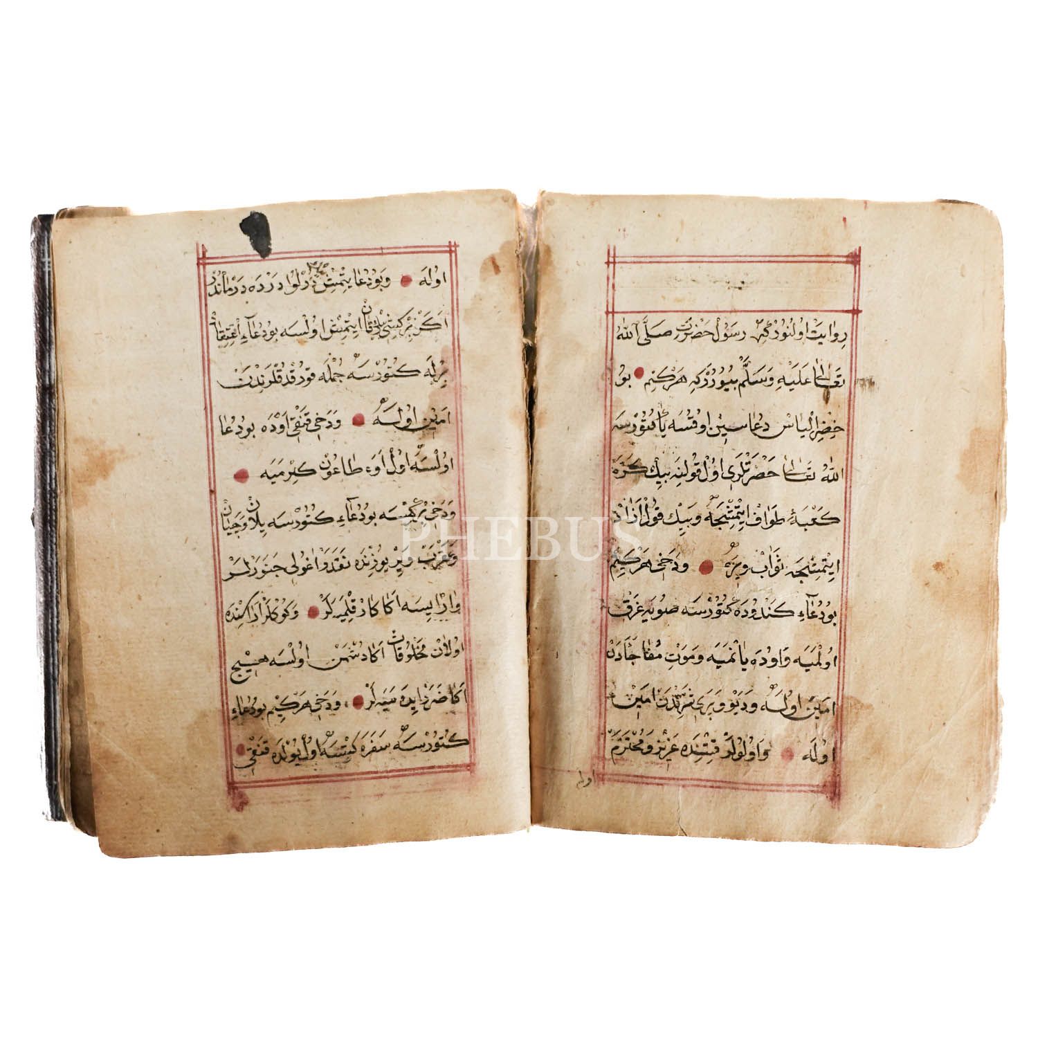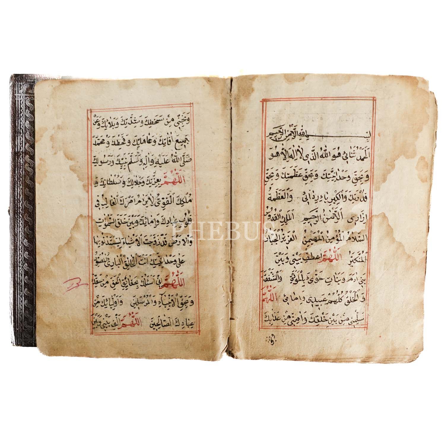 MECMUA (Dualar, hadis rivayetleri, hilye-i nebi, tılsımlar vs.), tüm sayfaları kırmızı mürekkeple cetvelli, deri dönem cildinde, baştan ve sondan eksik sayfaları var, kitabın son kısmı su lekeli haliyle, 202 sayfa, 10x14 cm…
