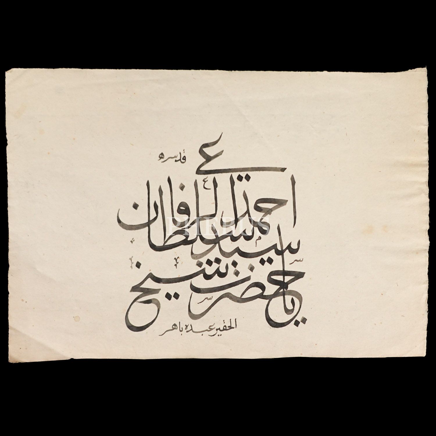 "Yâ Hazreti Şeyh Sultan Seyyid Ahmed er-Rıfâî kuddise sirruh, ketebe: el-Hakir Andühu Bahir, sülüs istif, 18x12 cm...