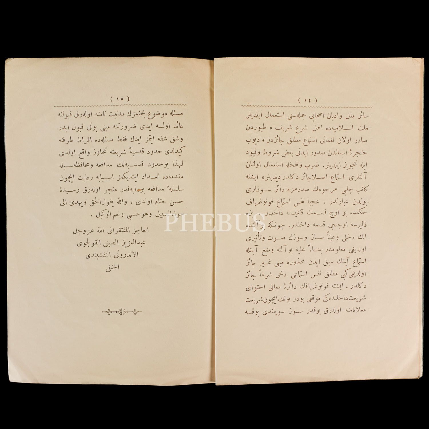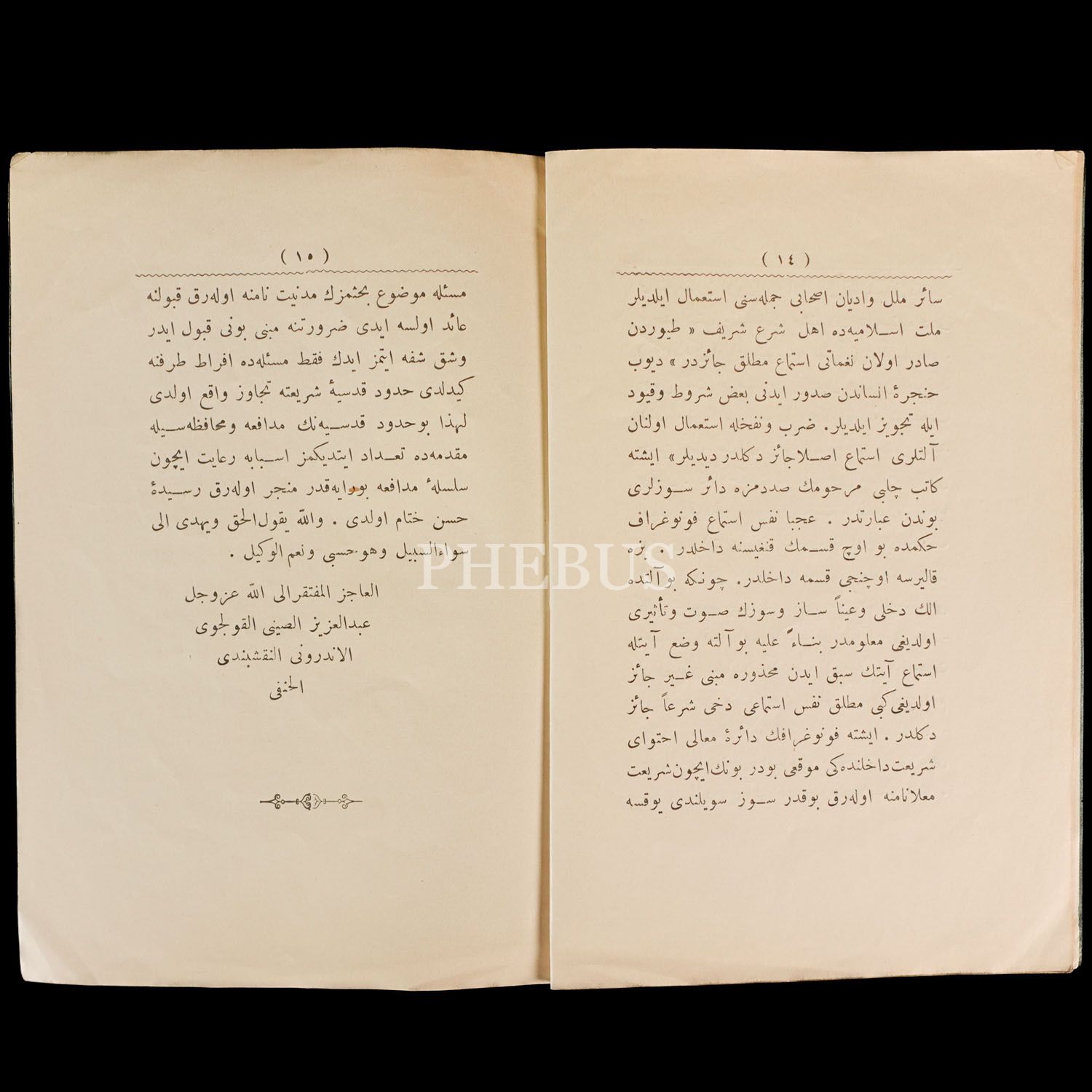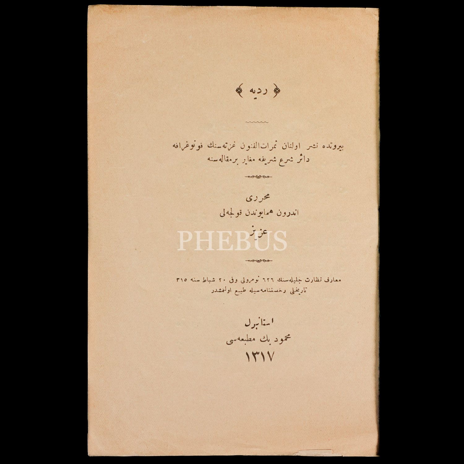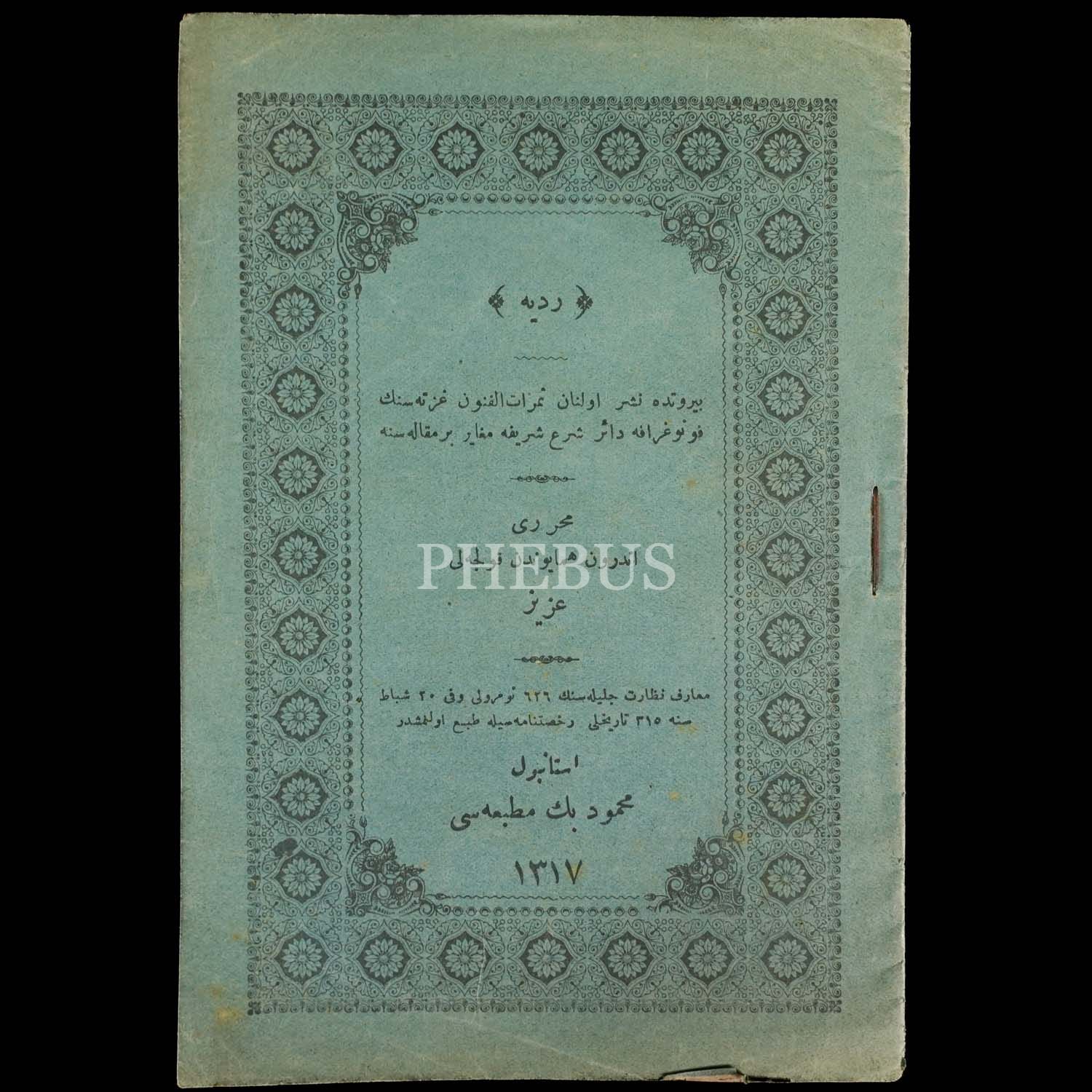 REDDİYE "Beyrut´ta neşrolunan Semratülfünun Gazetesi´nin fonografa dair şer-i şerife mugayir bir makalesine", Enderun-ı Hümayun´dan Kolcalı Aziz, 1317, Mahmud Bey Matbaası, 15 sayfa, 18x12 cm...