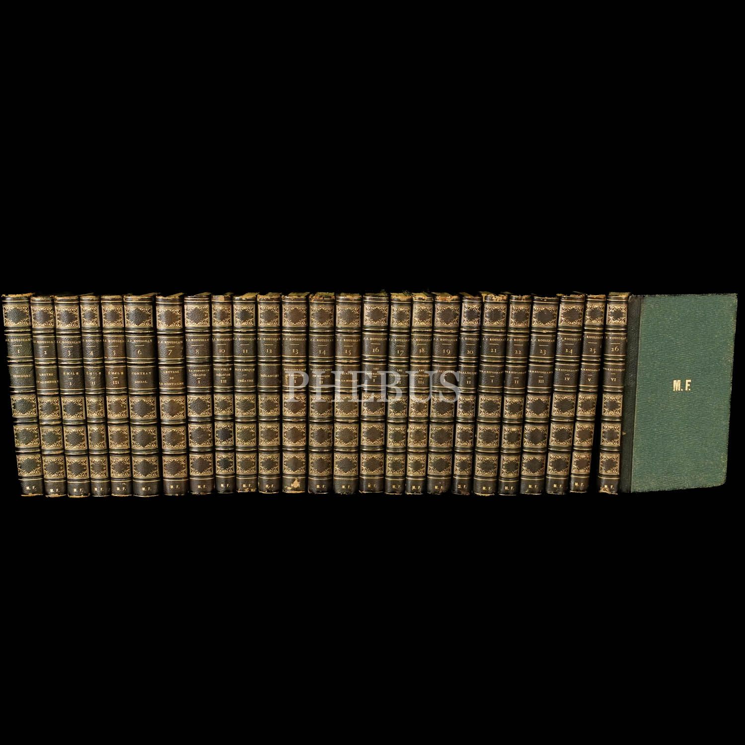 Deri sırtları panelli ve altın yaldız başlıklı, kapakları cilt bezi kaplı dönem ciltlerinde... İç kapakları ebru süslemelidir. Lot içeriği: 1) Tome 1 - Discours 2) Tome 2 - Lettre A D´Alembert 3) Tome 3 - Emile. Tome I 4) Tome 4 - Emile. Tome II 5) Tome 5 - Emile. Tome III 6) Tome 6 - Contrat Social 7) Tome 7 - Par P. R. AUGUIS. Lettre A C. De Beaumont. Lettres de la Montagne 8) Tome 8 - Par P. R. AUGUIS. Nouvelle Neloise. Tome I 9) Tome 10 - Par P. R. AUGUIS. Nouvelle Neloise. Tome III 10) Tome 11 - Botanique. Theatre 11) Tome 12 - Melanges 12) Tome 13 - Dictionaire de Musique. Tome I