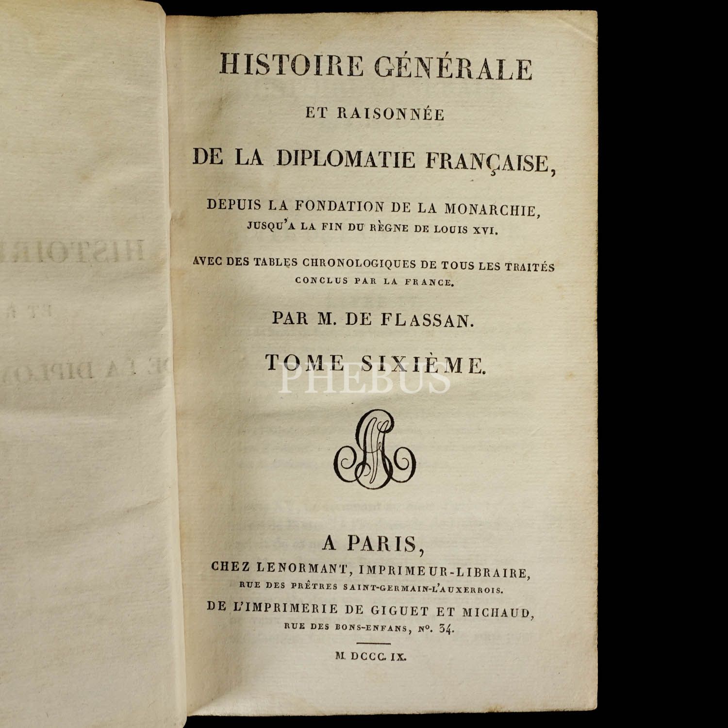 HISTOIRE GENERALE ET RAISONNEE DE LA DIPLOMATIE FRANÇAISE (6 cilt), M. De Flassan, 1809 (ilk baskı), Chez Lenormant, Imprimeur-Libraire, Paris, 538+430+492+494+524+553 sayfa, 13x20 cm...