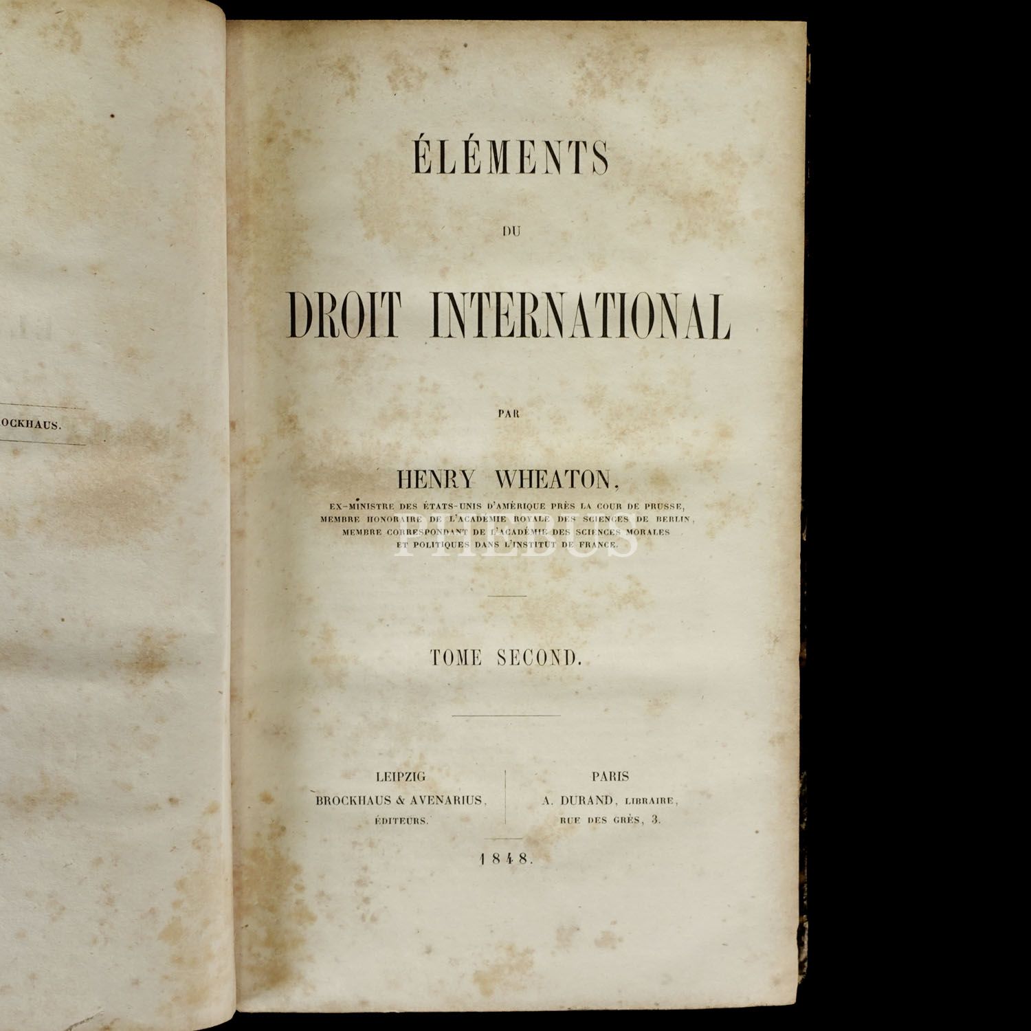 1) HISTOIRE DES PROGRES DU DROIT DES GENS (En Europe et En Amerique) - (Cilt 1, 1846, 403 sayfa) 2) ELEMENTS DU DROIT INTERNATIONAL (Cilt 1-2, 1848, 334+399 sayfa), F. A. Brockhaus, Leipzig, 14x23 cm...