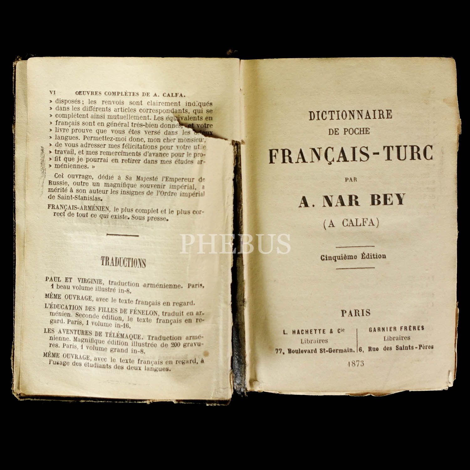 DICTIONNAIRE DE POCHE FRANÇAIS-TURC, A. Nar Bey (A Calfa), 1873, L. Hachette & Cie. / Garnier Freres, Paris, 448 sayfa, 9x13 cm...