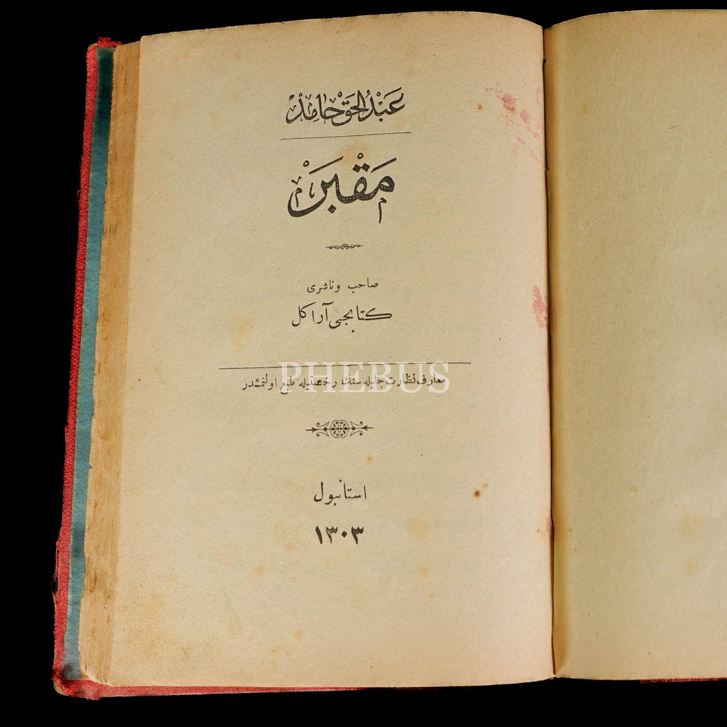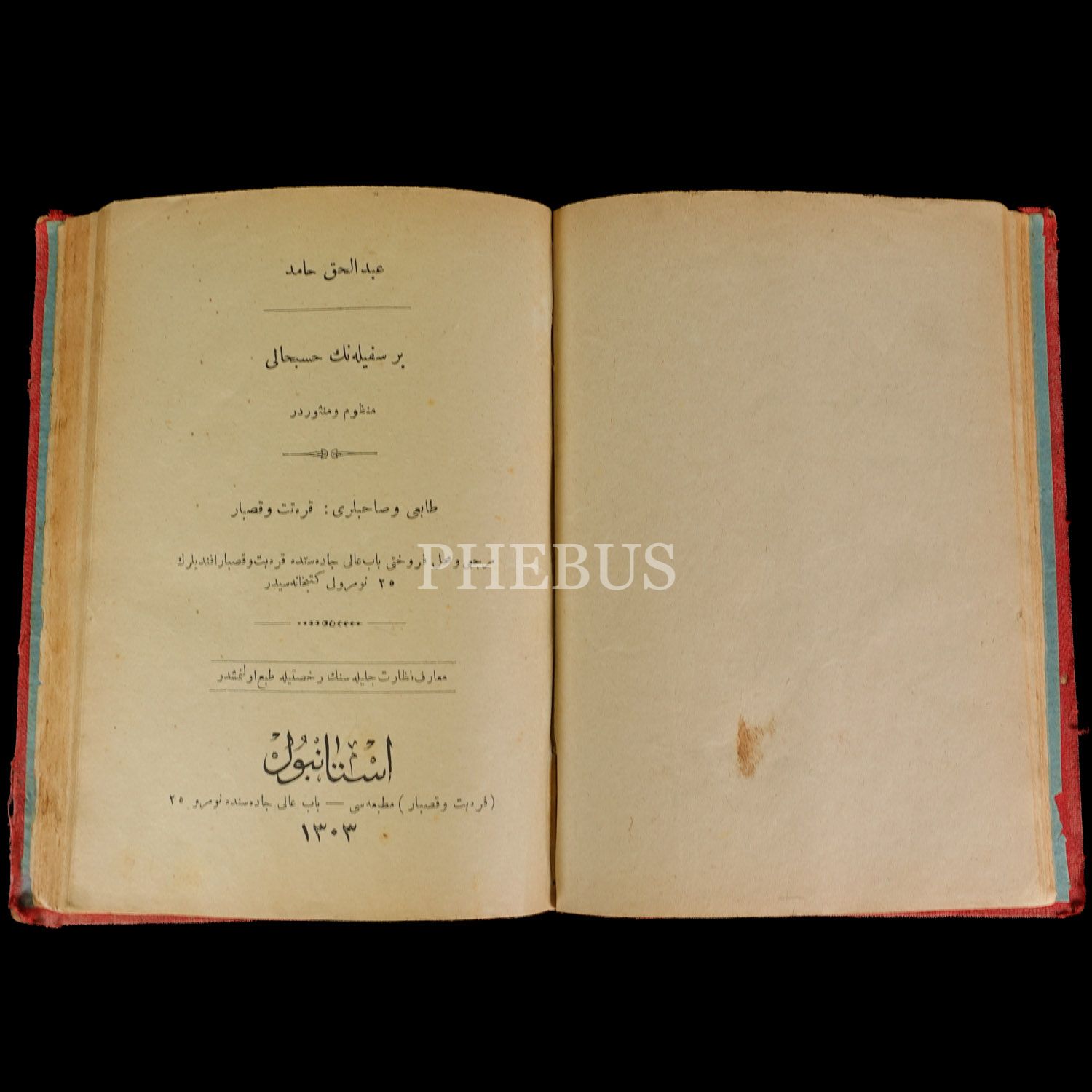 HACLE - ÖLÜ - BUNLAR ODUR - BİR SEFİLENİN HASBİHALİ - MAKBER, Abdülhak Hamid (Tarhan), 1303, Matbaa-i A.K. Tozliyan, 46+44+117 sayfa, deri sırtlı tuğralı kırmızı cildinde, 17x12 cm...