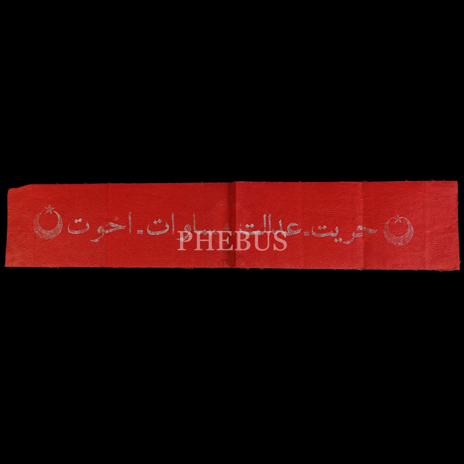 İkinci Meşrutiyet sloganı "Hürriyet - Adalet - Musavat - Uhuvvet" yazılı, hilal ve yıldız görselli pazubent, 37x7 cm...