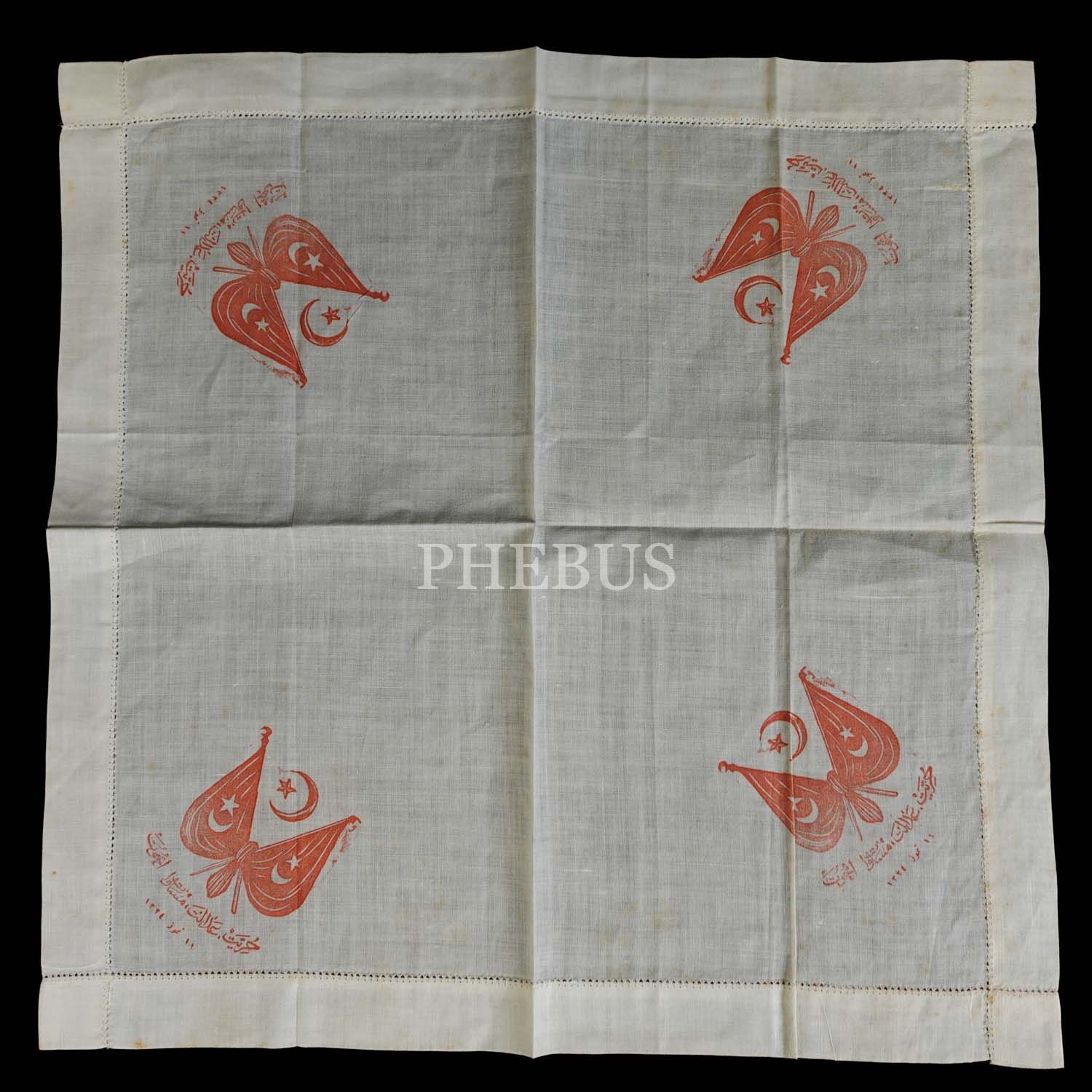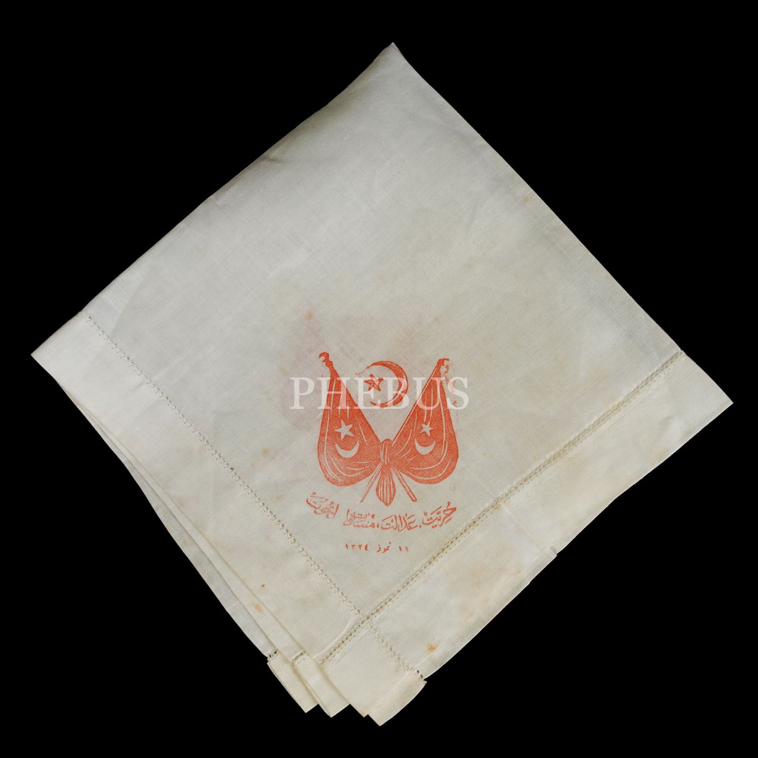 Dört bir köşesinde hilal ve yıldız görselli sancaklar ve "Hürriyet - Adalet - Musavat - Uhuvvet - 11 Temmuz 1324" yazılı mendil, 34x34