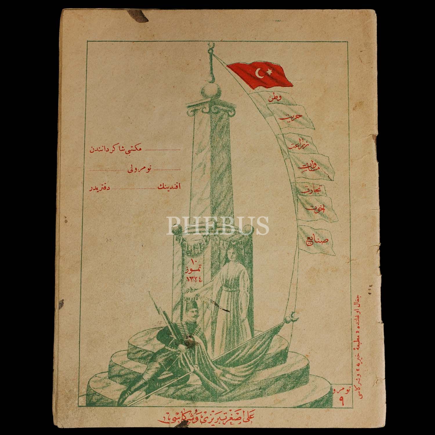 İkinci Meşrutiyet temalı kapağa sahip talebe defteri, "Ali Sağır ve Şürekası" 16x21 cm...