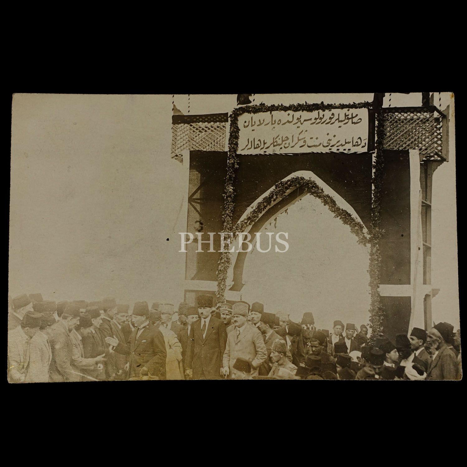 Mustafa Kemal Atatürk´ün, Cumhuriyet´in ilanı sonrası gerçekleştirdiği Samsun ziyaretinden bir enstantane, Atatürk´ün ziyareti vesilesiyle kurulan tak üzerinde Osmanlıca "Samsunlular kurtuluş yolunda parlayan deha yıldızını minnet ve şükran çelenkleriyle hâleler" yazılıdır, 14x9 cm...