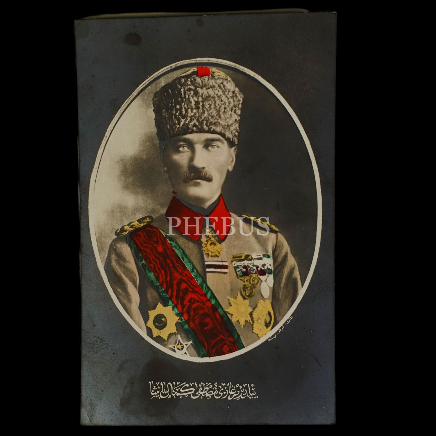Göğsünde madalyalarıyla Mustafa Kemal Atatürk, elle renklendirilmiş, ed. Foto Resna, 14x9 cm...