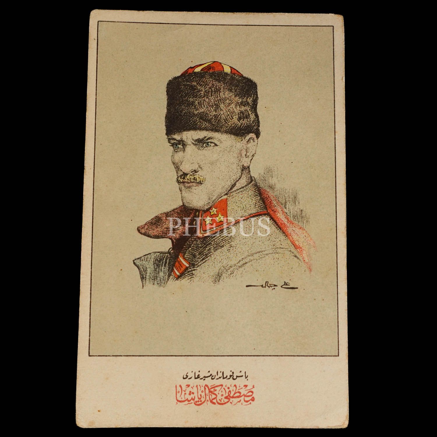 Ali Cemal imzalı Mustafa Kemal Atatürk resimli ve "Başkumandan Müşir-i Gazi Mustafa Kemal Paşa" başlıklı kartpostal, 9x14 cm...