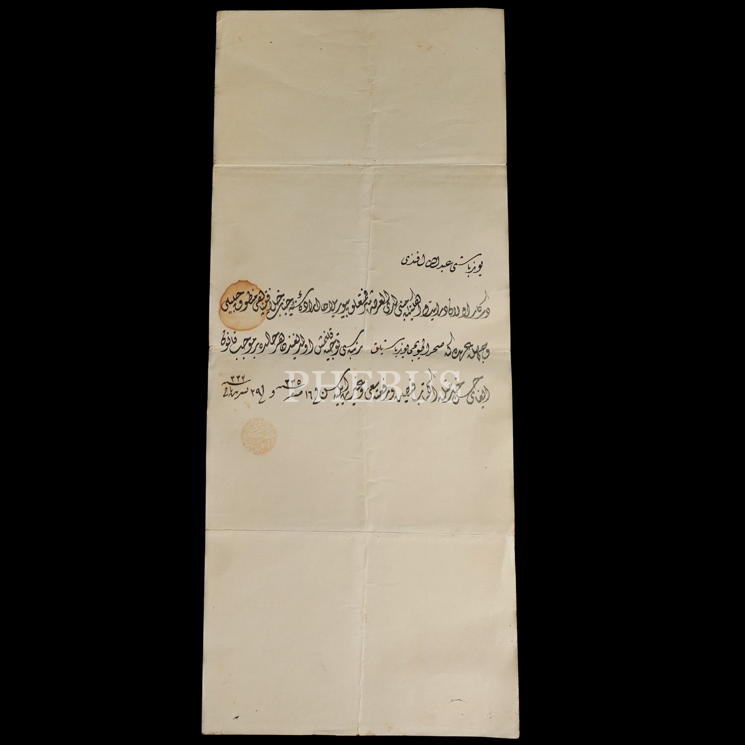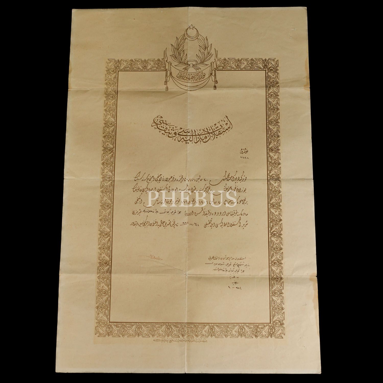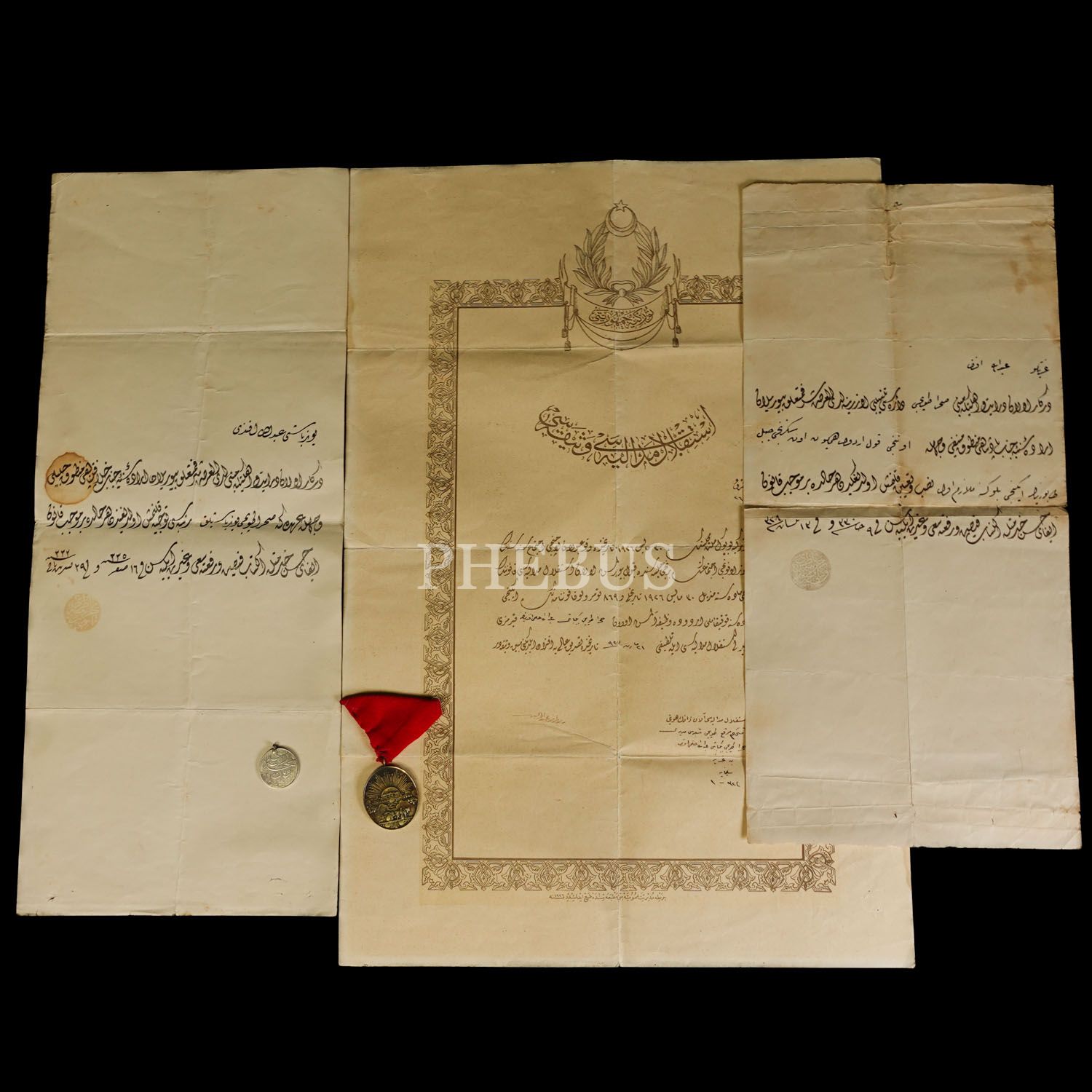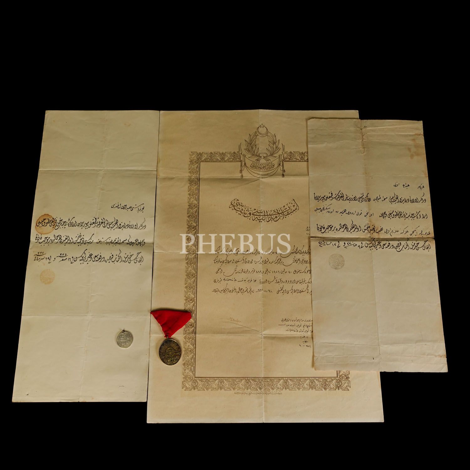 Sahra Topçusu Abdullah Efendi´nin, Harbiye Nazırı Mahmud Şevket Paşa´nın mührünü taşıyan rütbe terfi beratı ile Harbiye Nazırı Enver Paşa´nın mührünü taşıyan rütbe terfi beratı, Yunan Harp Madalyası ve İstiklal Madalyası beratı ile kırmızı şeritli İstiklal Madalyası....