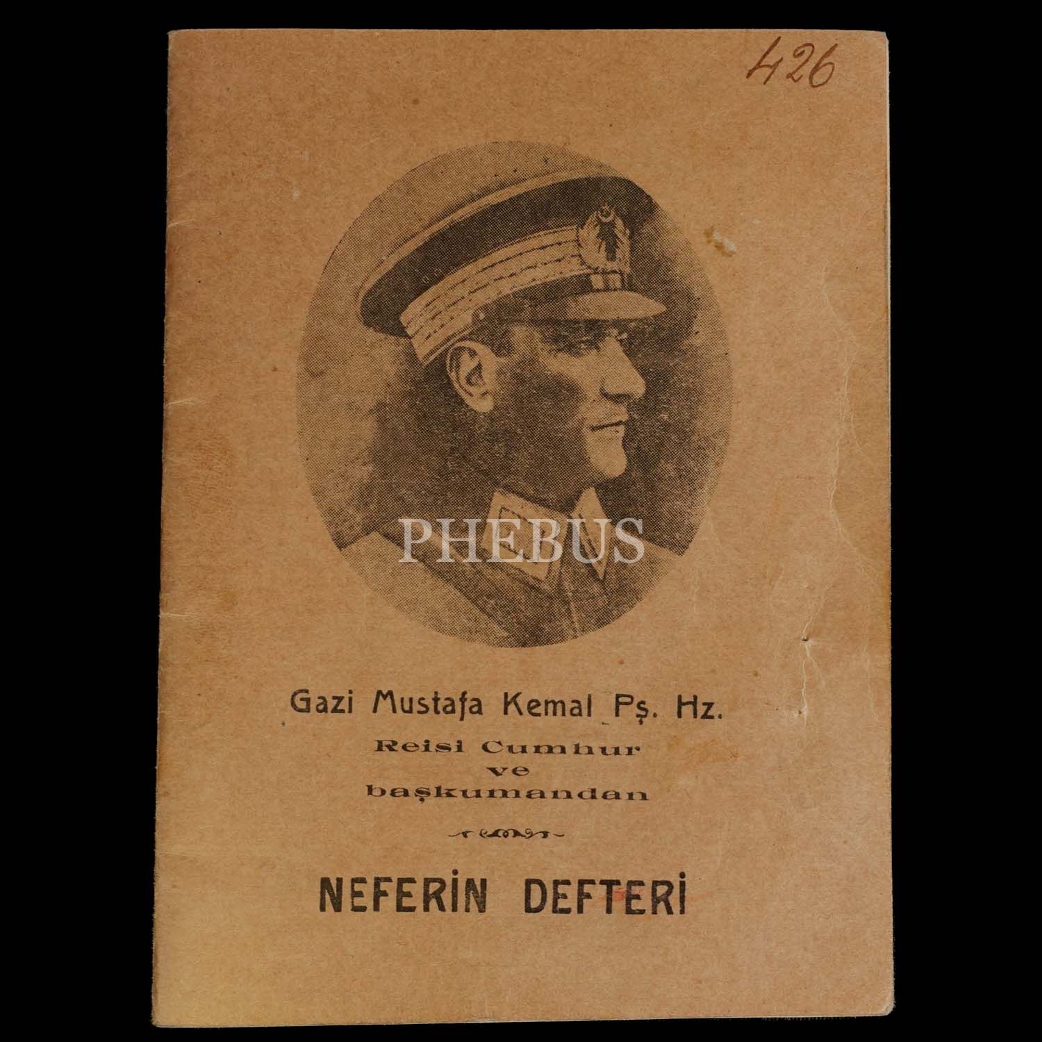 Mustafa Kemal Atatatürk görselli ve "Gazi Mustafa Kemal Pş. Hz. - Reisi Cumhur ve Başkumandan" başlıklı "Neferin Defteri", 32 sayfa, 10x14 cm...